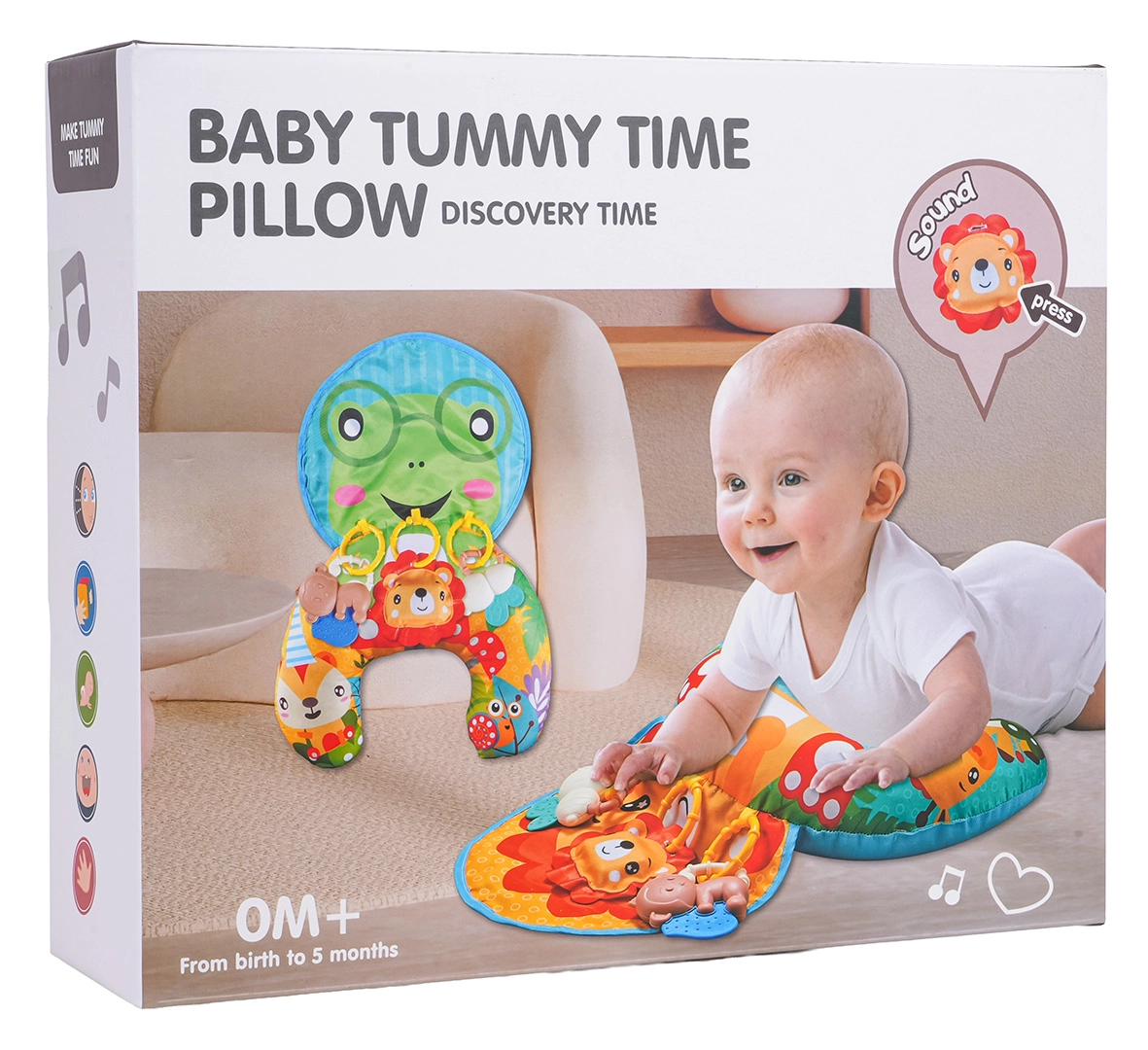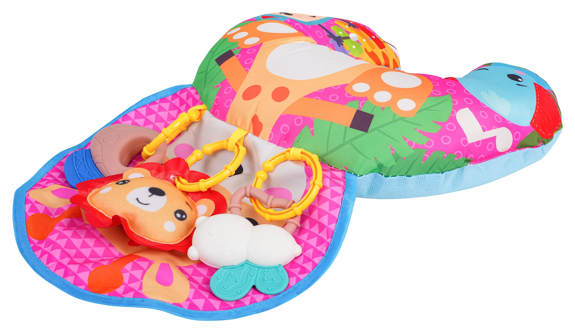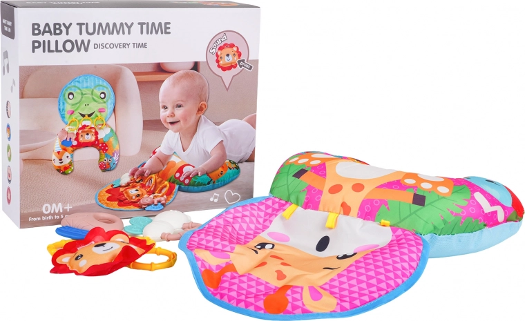 Coussin pour bébé doux et coloré en forme de U avec motif girafe, soutient le bébé lors du temps sur le ventre et en position assise. Il comprend des jouets suspendus amovibles avec anneaux de dentition, hochets et pouet, qui développent les sens et la motricité. Convient dès les premiers jours de vie, fabriqué avec des matériaux sûrs.