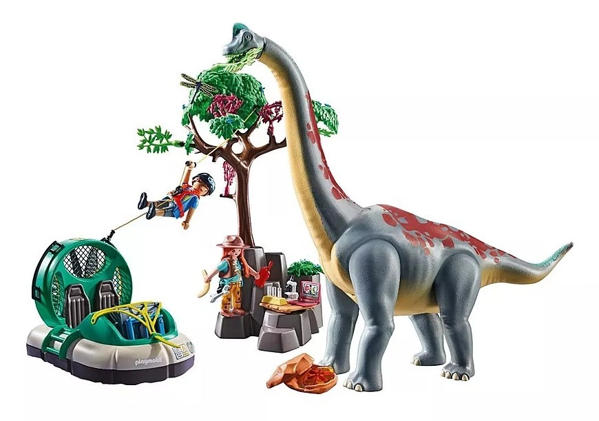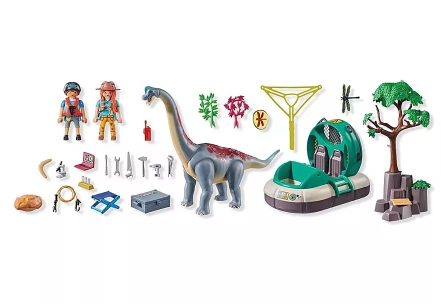 Le Brachiosaure possède une mâchoire articulée et des détails réalistes, l’arbre propose des feuilles amovibles pour un nourrissage interactif. Le set inclut aussi des « trésors cachés », par exemple une libellule emprisonnée dans l’ambre, des outils, des cordes, des filets et de l’équipement de recherche, y compris un ordinateur portable pour documenter les comportements.
