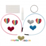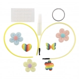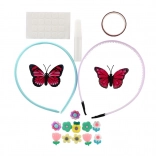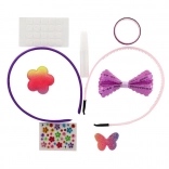 2 serre-têtes en plastique, assortiment de décorations (appliqués papillon, cœur, fleur, strass), pastilles autocollantes, petite colle; certains kits peuvent contenir un ruban/cordon ou un anneau