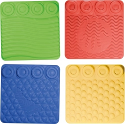 Chaque tapis possède un relief unique (vagues, points, formes et empreintes) qui masse délicatement les pieds et les paumes, renforçant la perception sensorielle et l’équilibre.