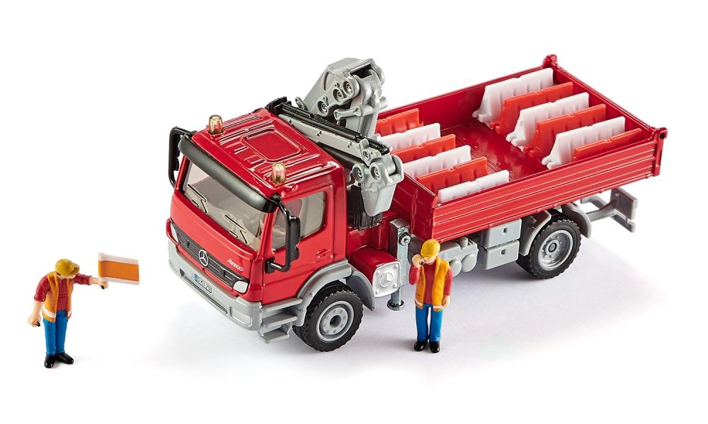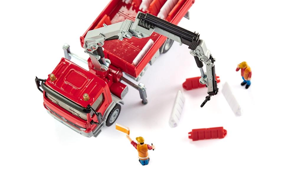 Modèle réaliste du camion Mercedes Atego de SIKU à l’échelle 1:50, remarquable par ses détails, sa combinaison métal et plastique et ses éléments fonctionnels. La grue pivotante, la benne basculante, les béquilles extensibles et les roues en caoutchouc assurent un jeu fluide et une longue durée de vie. Le coffret inclut des figurines d’ouvriers et des blocs routiers pour des scénarios de construction créatifs.