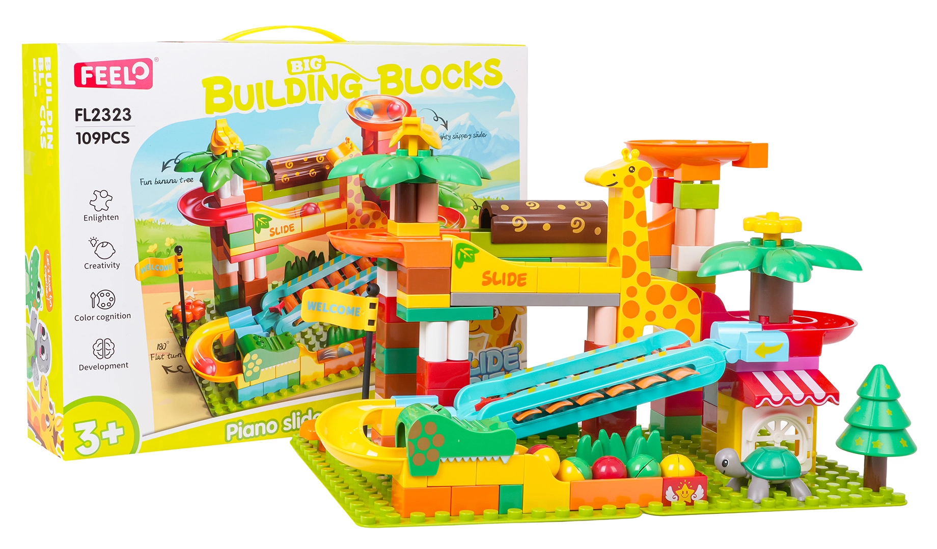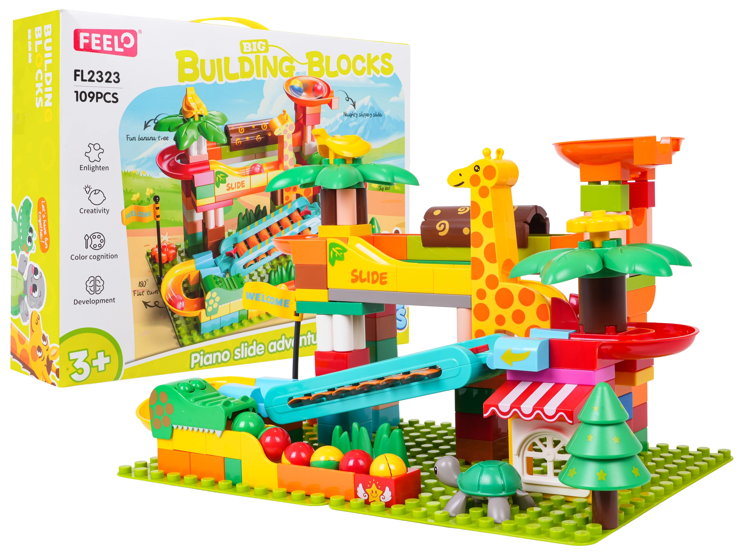 Ce kit de construction créatif apporte une ambiance safari dans la chambre d’enfant : palmiers, animaux et maisonnette sont complétés par une piste à billes ingénieuse avec toboggans, entonnoirs et un élément piano – lorsque les billes passent sur le xylophone, elles créent des mélodies joyeuses. Une base stable et des pièces à encliqueter facilement assurent une construction et un jeu agréables.