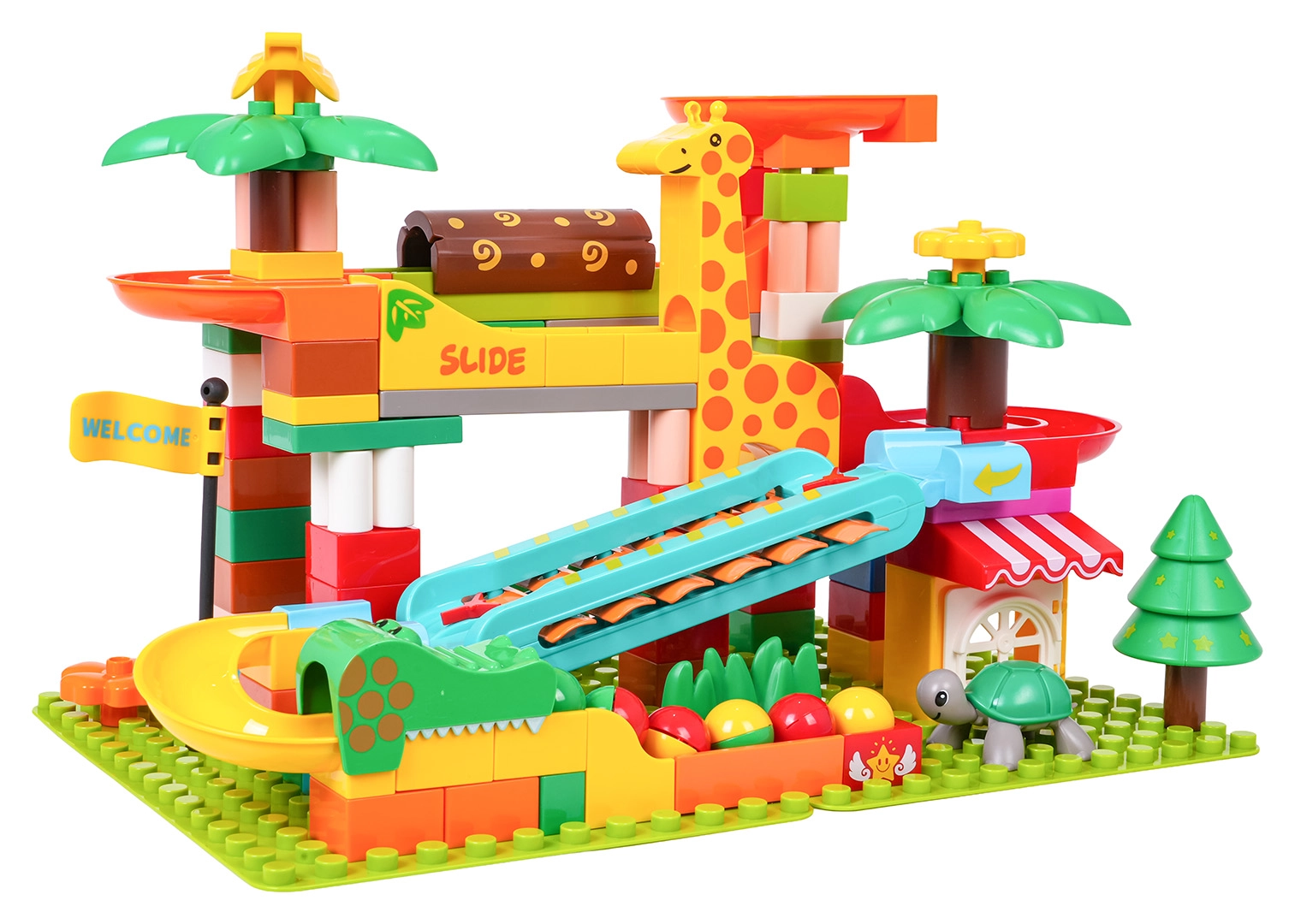 Des rampes colorées, des entonnoirs et des toboggans avec des décorations de palmiers et d’animaux invitent à construire sans cesse de nouveaux parcours.