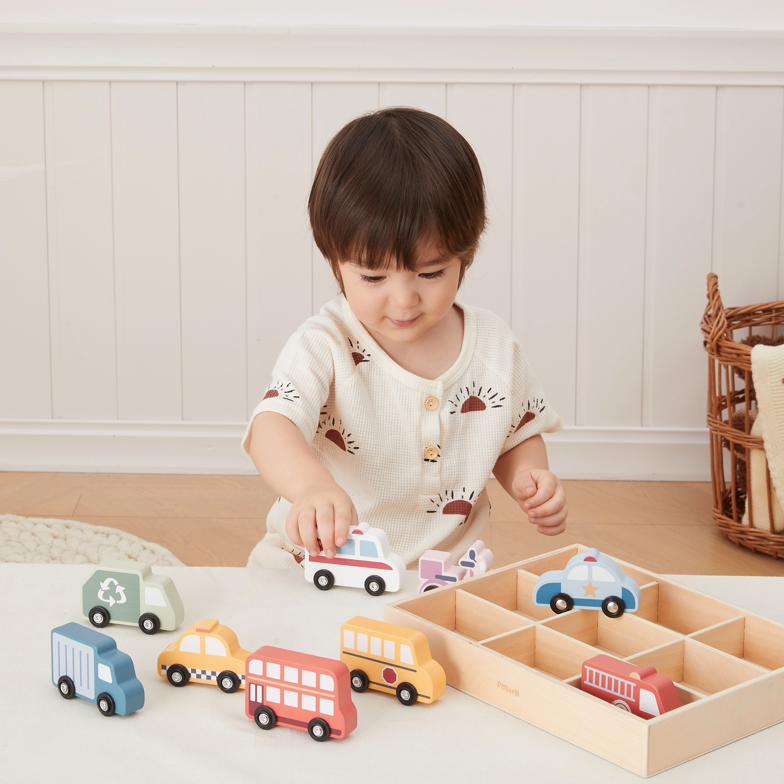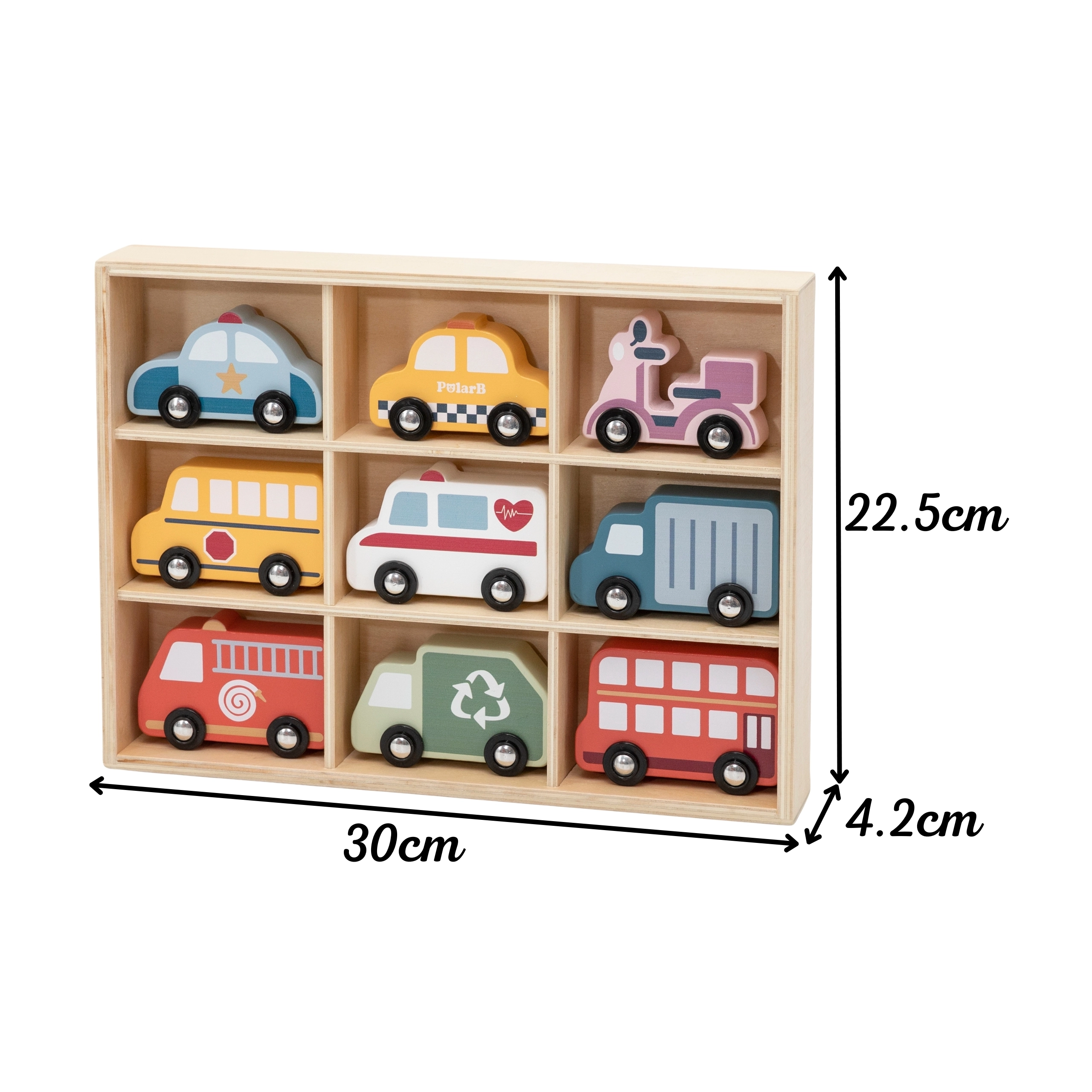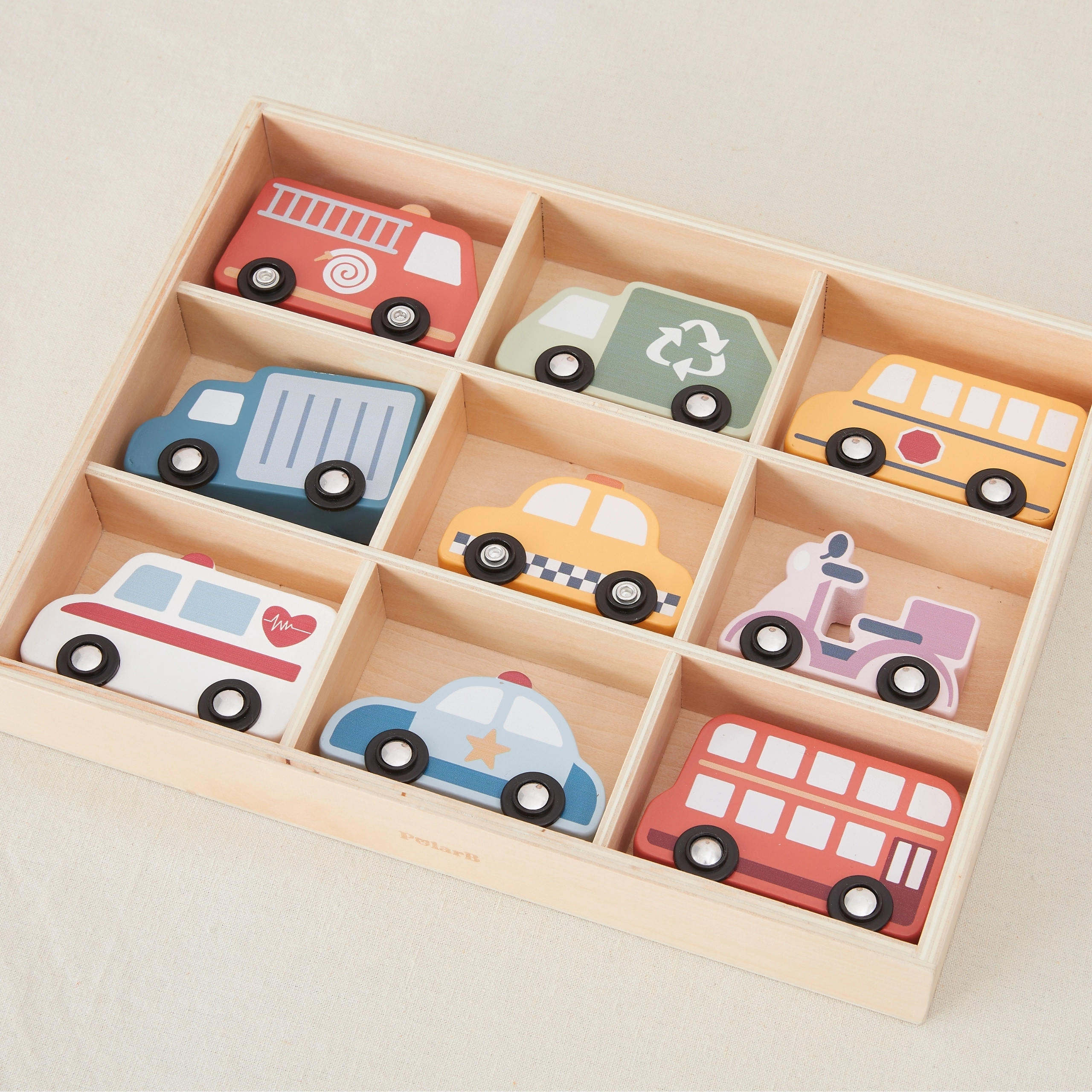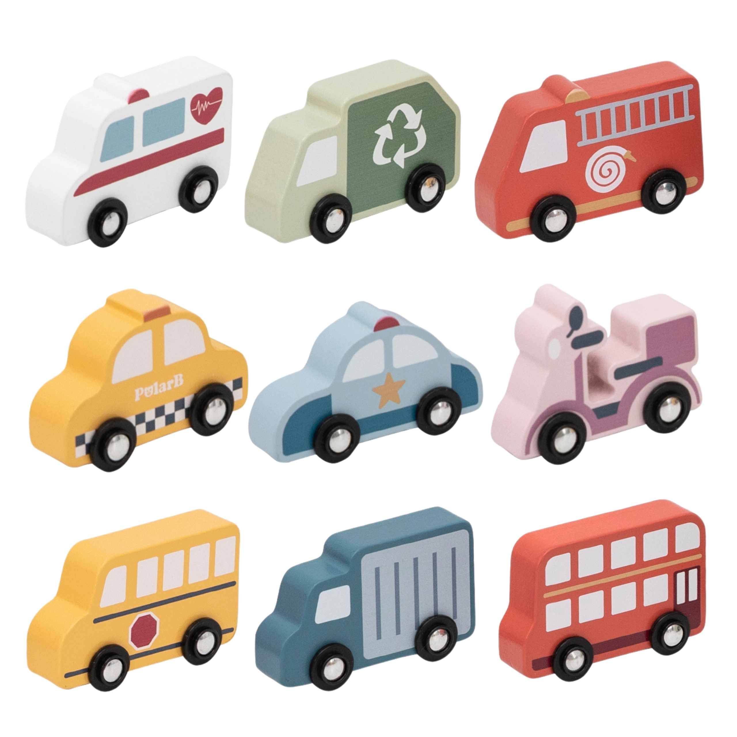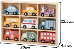 Ce coffret en bois de qualité apporte tout ce qu’il faut pour jouer à la ville de façon créative : camion de pompiers, ambulance, police, taxi, bus (y compris à impériale), camion-benne, scooter et plus encore. Les dimensions compactes et les bords arrondis sont sûrs et agréables pour la prise en main des enfants, les roues roulent en douceur sur toute surface.