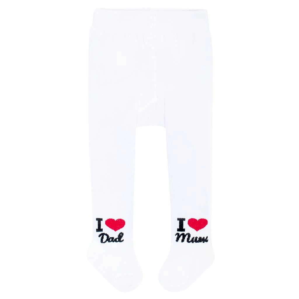 Ces collants pour enfants NEW BABY de couleur blanche sont ornés d’une illustration gaie au dos et des inscriptions « I Love Mum » et « I Love Dad » sur les jambes. Parfaits pour un usage quotidien à la maison comme en promenade, leur matière agréable garantit le confort des enfants tout au long de la journée.