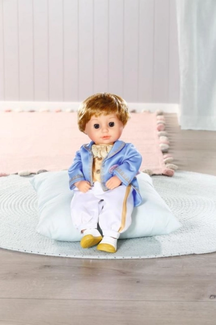 Adorable prince de la collection Baby Annabell de 36 cm, idéal comme première poupée pour les enfants dès 1 an. Il possède un corps souple en tissu, des yeux dormeurs et une tenue à coupe easy fit pour un habillage facile. Une élégante veste bleu royal avec gilet doré, un pantalon blanc à bande dorée et des petites chaussures blanc et or stimulent l’imagination et le jeu de rôle.