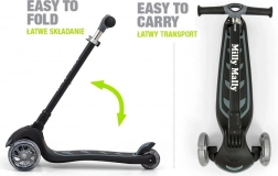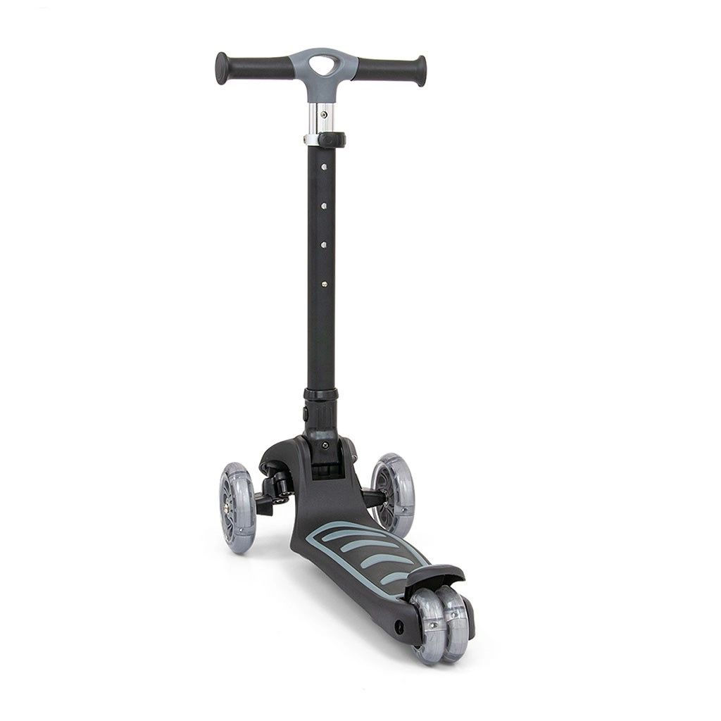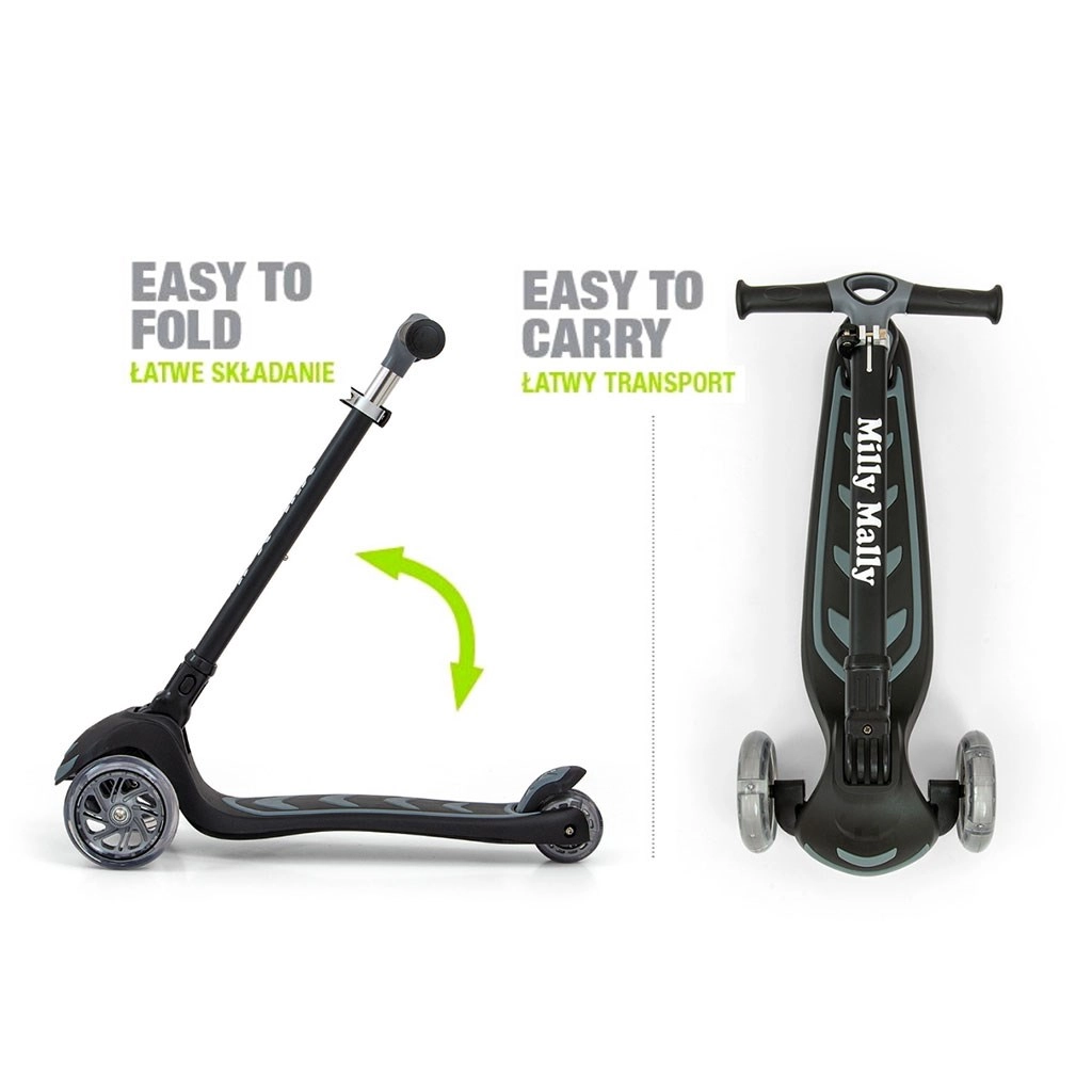 Trottinette pour enfants légère et résistante MILLY MALLY BOOGIE en coloris noir, offrant un système tricycle stable avec double roue arrière, un guidon réglable sur 3 niveaux et des roues PU lumineuses pour une conduite ludique et sûre. Plateau antidérapant, frein sur le garde-boue arrière et roulements de qualité ABEC-7 pour une conduite fluide et silencieuse, dès 3 ans et jusqu’à 50 kg.