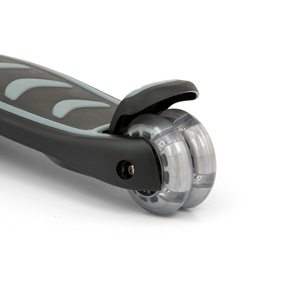 Son grand atout, ce sont les trois roues pour une stabilité maximale – à l’avant, des roues PU lumineuses de 120 mm et, nouveauté, une double roue arrière lumineuse de 80 mm avec frein sur garde-boue. Poignées souples, plateau antidérapant et roulements ABEC-7 assurent une conduite confortable, silencieuse et sûre.