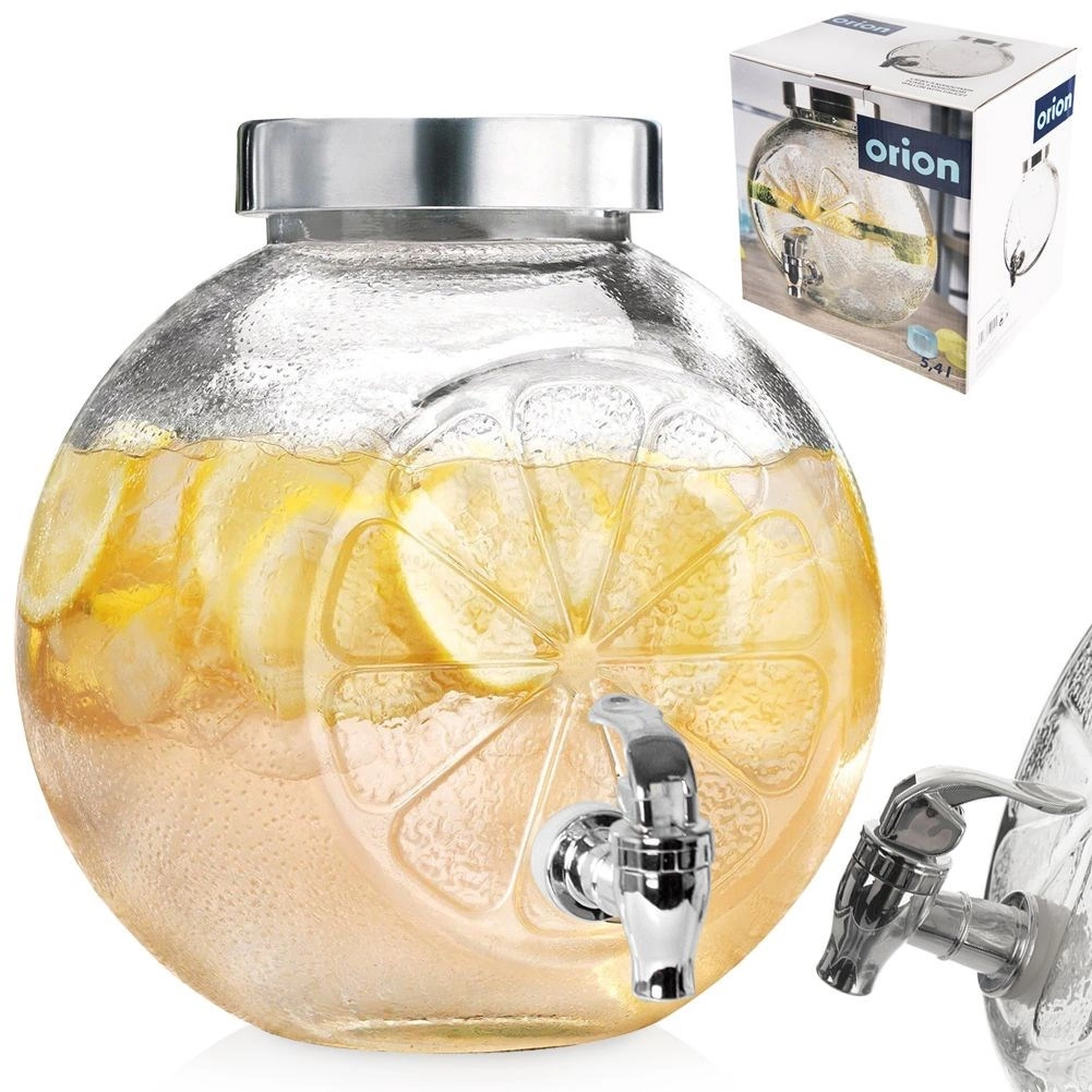 Distributeur de boissons élégant en verre d’une capacité de 5,4 l avec couvercle métallique et robinet pratique, idéal pour les limonades, les jus et le thé glacé maison. Verre transparent épais avec motif décoratif d’agrumes, large ouverture pour un remplissage facile et couvercle anti-insectes – un choix parfait pour les fêtes au jardin comme pour le service à la maison.