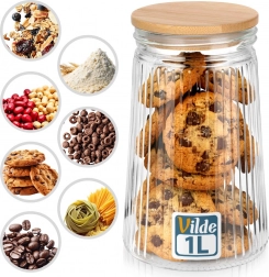 Bocal en verre élégant de 1 l avec couvercle en bambou et joint en silicone pour garder vos aliments frais plus longtemps. Grâce au verre nervuré transparent, vous contrôlez toujours le contenu tout en apportant à la cuisine un aspect soigné et élégant. Idéal pour le café, les biscuits, les pâtes, le muesli ou autres denrées sèches. Verre borosilicaté résistant et fermeture hermétique pour préserver fraîcheur et arômes.