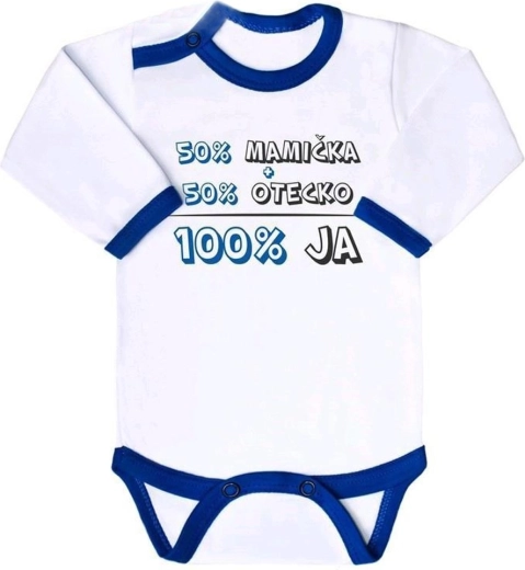 Adorable body en coton à manches longues de la marque New Baby avec l’inscription amusante 50 % MAMAN + 50 % PAPA – 100 % MOI. Fabriqué en 100 % coton pour une douceur et un confort optimal pour bébé, avec un pratique système de fermeture par pressions à l’épaule et entre les jambes pour un habillage et un change faciles. Les couleurs d’impression certifiées sont douces et adaptées aux enfants.