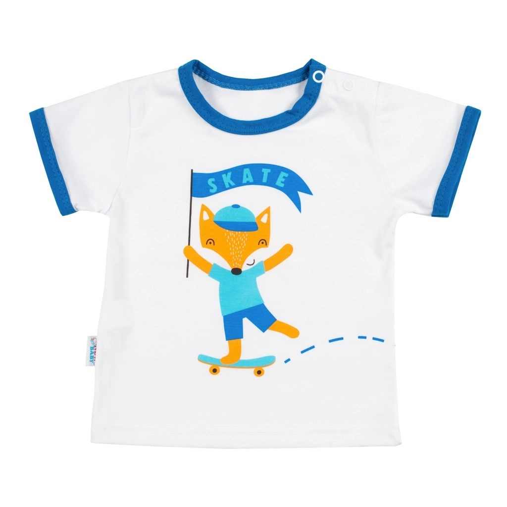 Adorable ensemble deux pièces New Baby avec motif renard, idéal pour l’été. Il comprend un t‑shirt à manches courtes et un short confortable en 100 % coton. Le t‑shirt possède une fermeture pratique à l’épaule pour un habillage facile et est décoré d’un joyeux imprimé renard avec l’inscription SKATE. Le short uni avec ceinture élastiquée assure un confort maximal pour bébé.