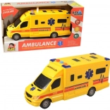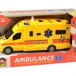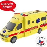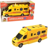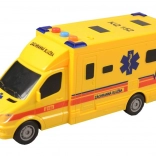 Ambulance jouet réaliste à friction avec effets lumineux, sirène et messages vocaux du dispatching et de l’équipage. Fabrication en plastique, longueur env. 19 cm, idéale pour les garçons et les filles dès 3 ans.