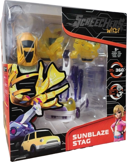 Le set Screechers Wild! de Alpha Group propose le personnage Sunblaze Stag, qui se transforme en un clin d’œil d’un cerf robuste en un véhicule jaune rapide. La pièce d’énergie active une transformation automatique qui ajoute tension et vitesse au jeu – idéal pour les duels dans la Zephyr City futuriste.