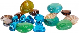 Dans le bloc, vous trouverez des galets lisses et brillants dans des nuances de bleu, de vert et d’ambre, ainsi que de petits coquillages. Chaque pièce est unique.