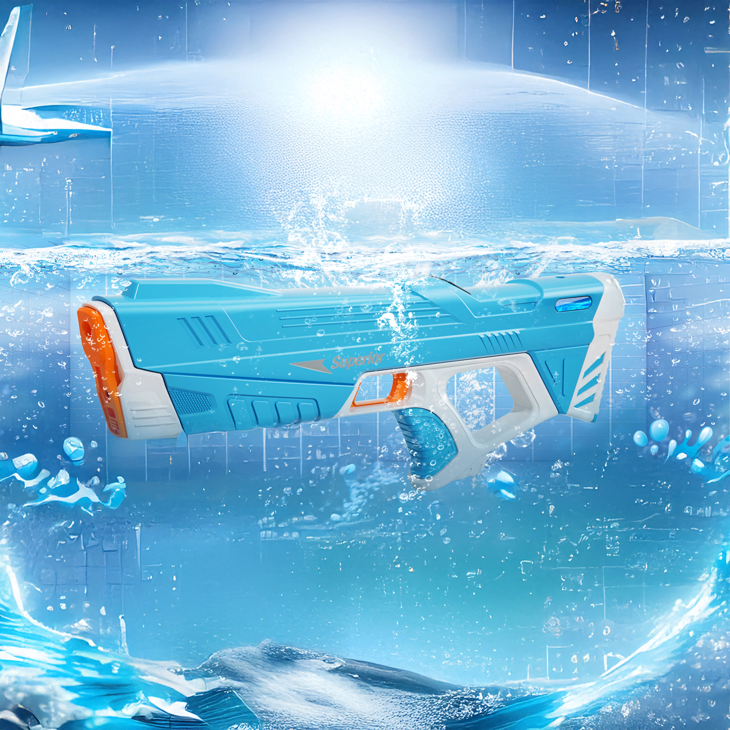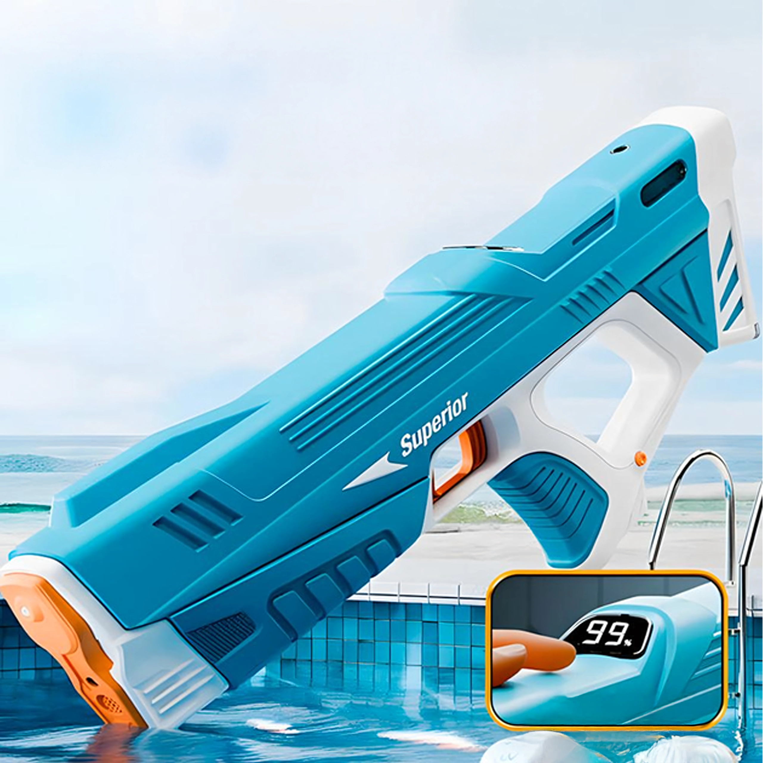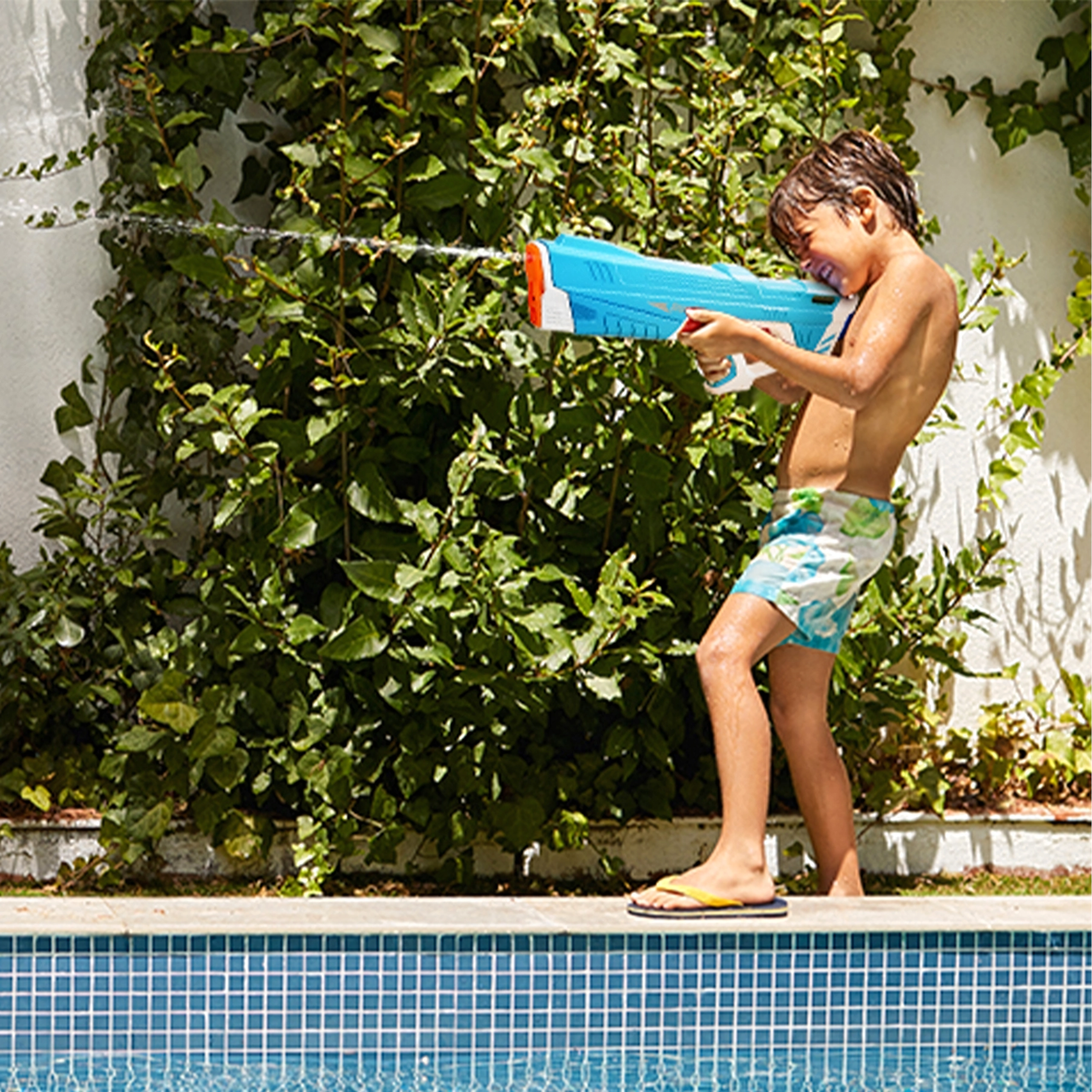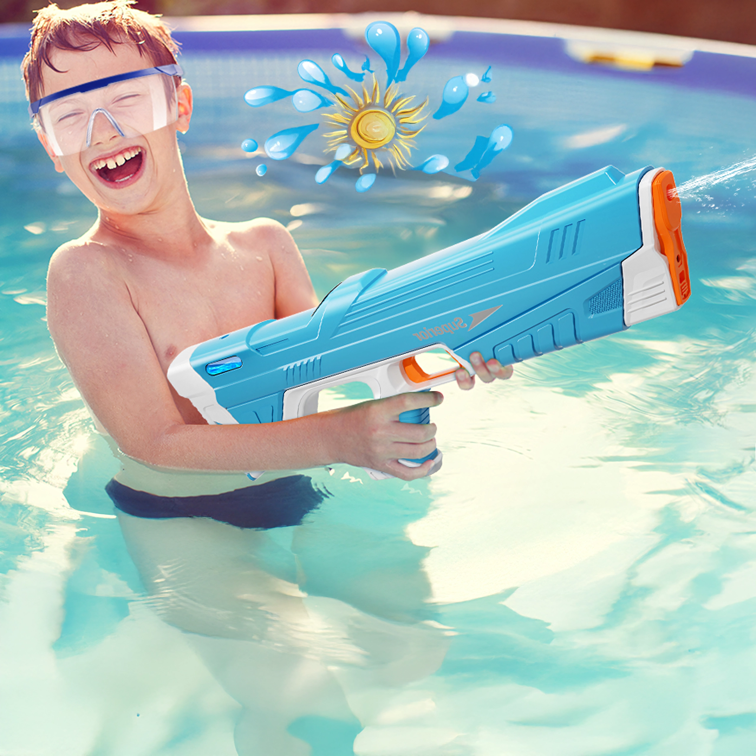 Le pistolet à eau électrique offre le confort sans pompage et une longue autonomie grâce à la recharge USB. Sa poignée ergonomique, sa construction en plastique résistant et son jet dynamique garantissent des duels pleins d’action à la piscine comme à la plage.