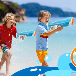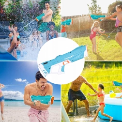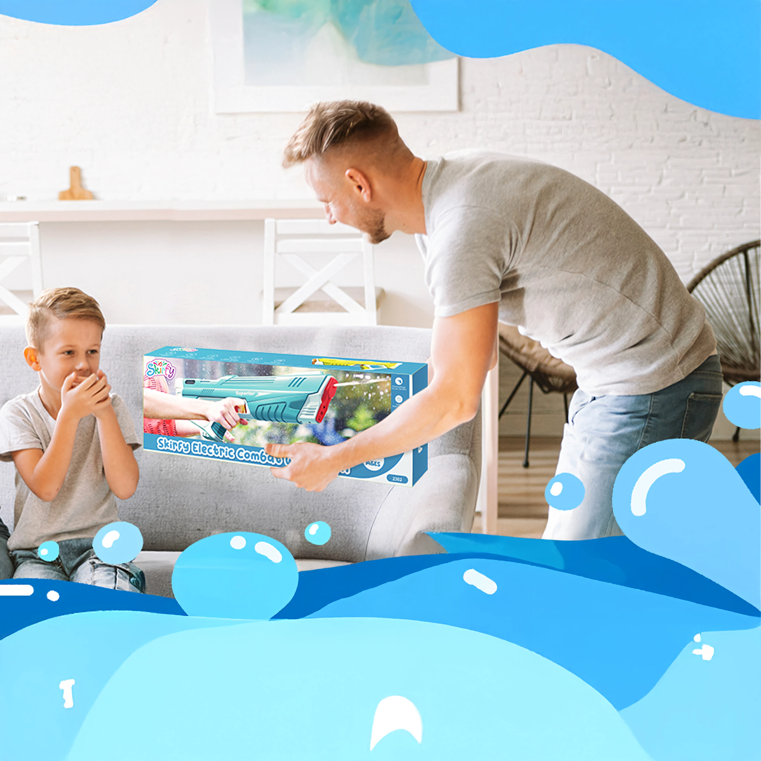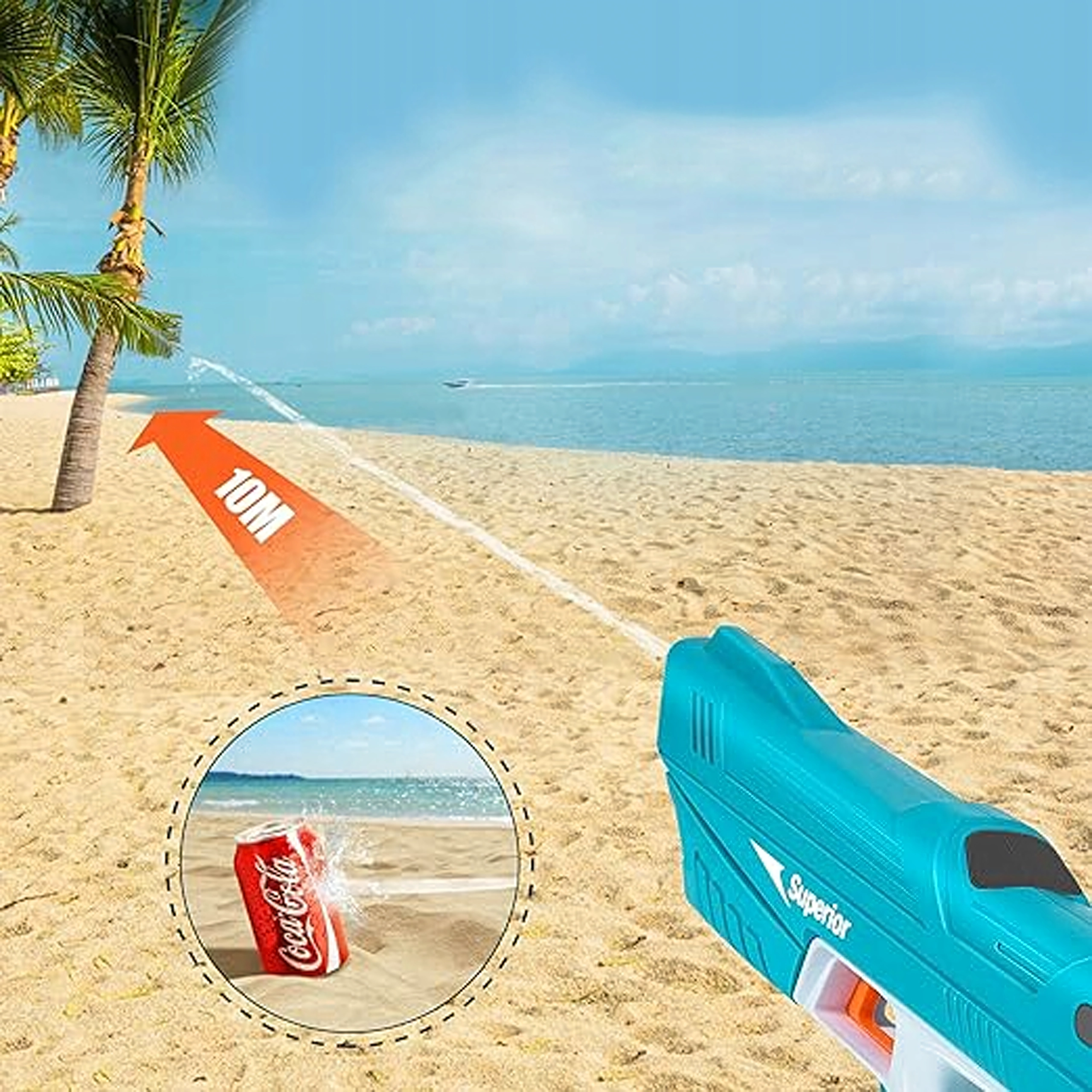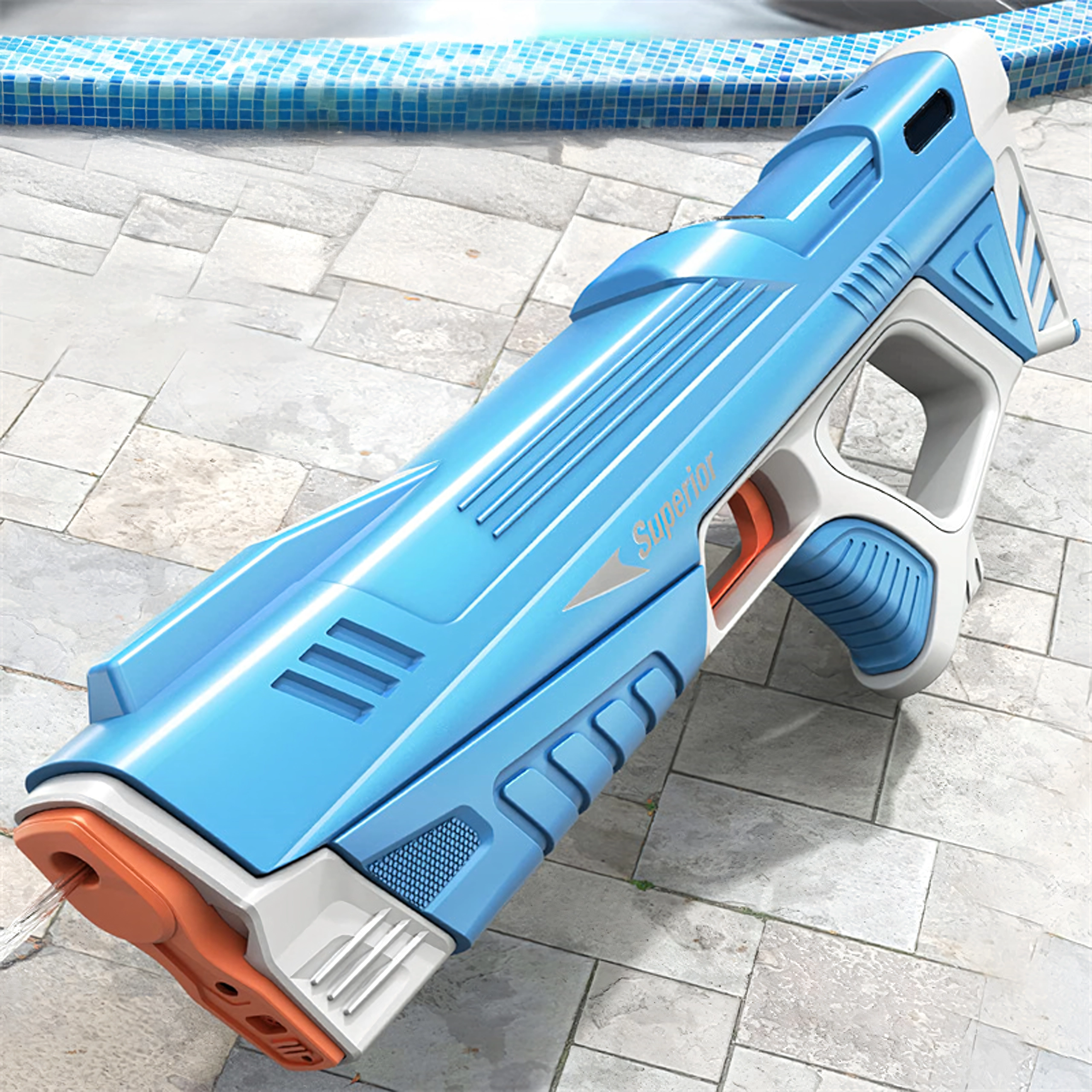 Le pistolet à eau électrique offre le confort sans pompage et une longue autonomie grâce à la recharge USB. Sa poignée ergonomique, sa construction en plastique résistant et son jet dynamique garantissent des duels pleins d’action à la piscine comme à la plage.