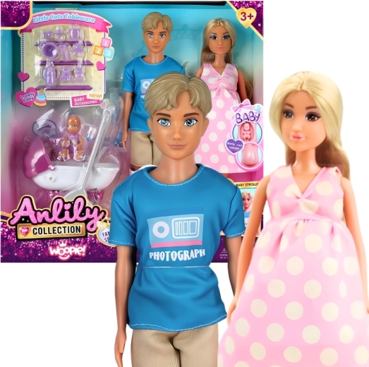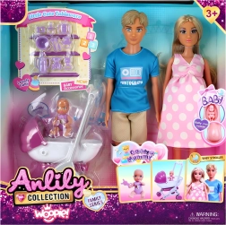 - Maman enceinte avec bébé amovible, papa, bébé, poussette, accessoires (biberon, bol, tétine, couches, peigne, petite assiette)