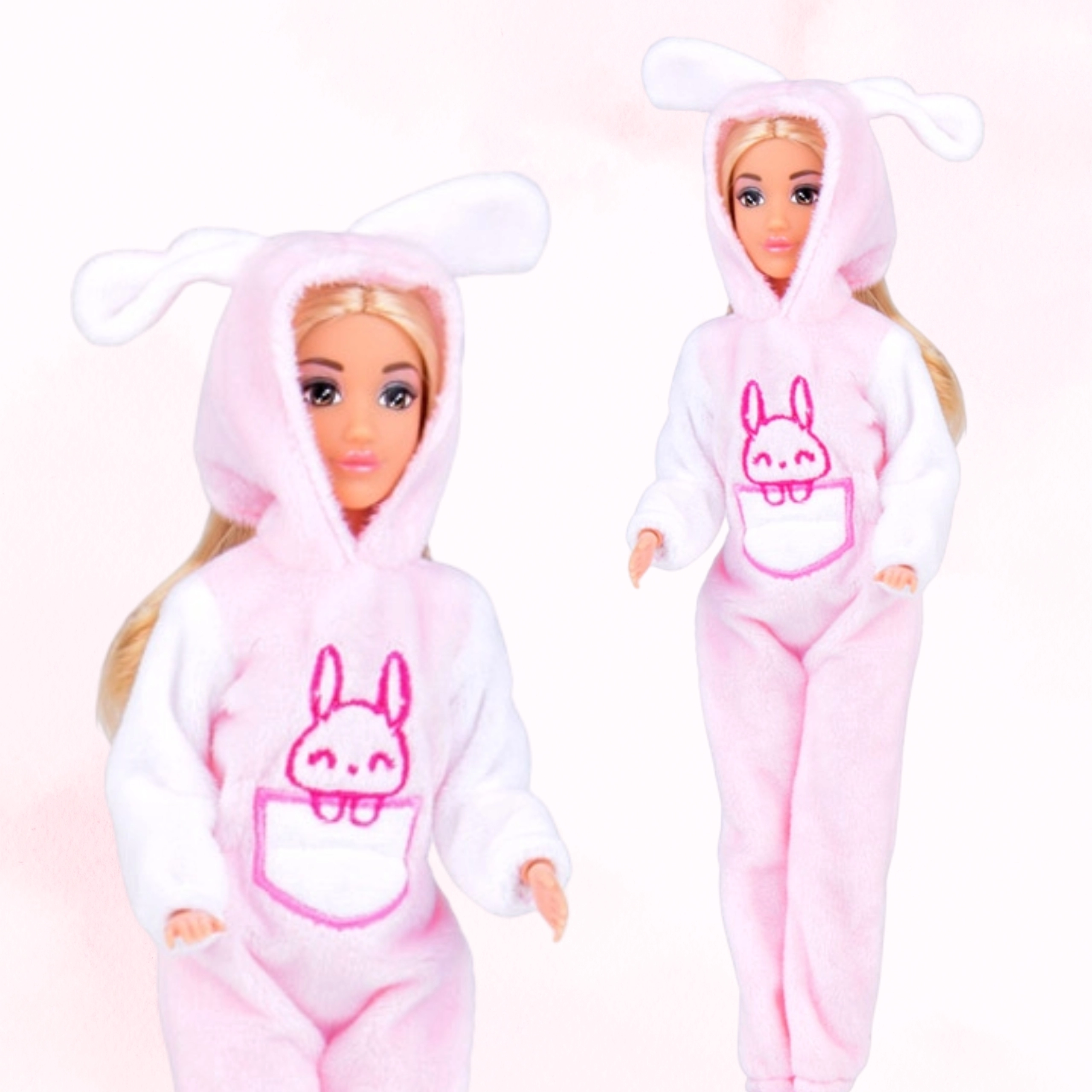 Découvrez un set magique inspiré par la tendance des combinaisons animales. Les poupées en tenues assorties roses de lapin arborent un mignon motif de lapin sur la poitrine, sont agréables au toucher et invitent à la créativité et à la narration d’histoires. Grâce à leurs membres articulés, elles s’habillent facilement et prennent de nombreuses positions.