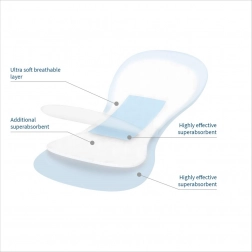 La surface spéciale ondulée répartit le liquide de façon uniforme, évitant que la serviette ne colle à la peau et minimisant les irritations. Le film protecteur inférieur empêche les fuites et protège les sous-vêtements des salissures, tandis que la bande adhésive assure une fixation stable, en mouvement comme en position allongée.