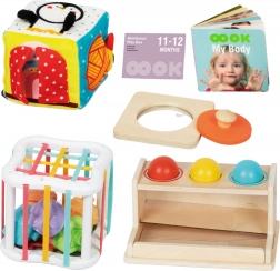 - Cube sensoriel élastique (6 blocs), boîte en bois « pousse la balle » (3 balles), pièce/puzzle miroir, cube de manipulation 3D, guide illustré