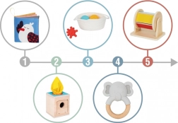 Ce coffret étudié, inspiré de la méthode Montessori, offre tout ce dont l’enfant a besoin aux premiers stades de découverte du monde. Les jouets stimulent en douceur la vue, le toucher et l’ouïe, encouragent naturellement la pensée logique et renforcent la motricité fine et la coordination œil-main. Le guide pratique pour les parents conseille quand et comment introduire chaque jouet.