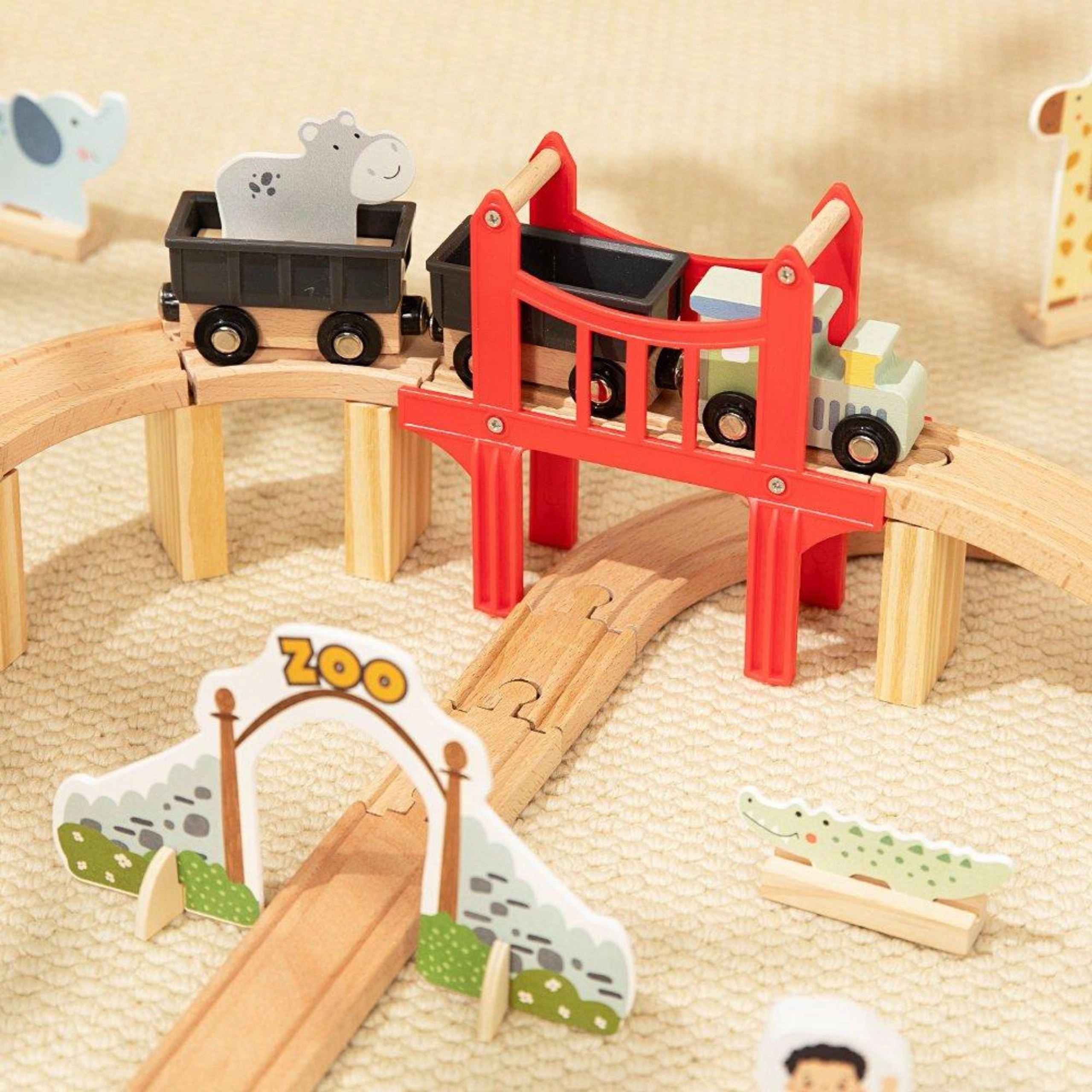 L’ensemble est conçu pour le jeu et le développement des compétences : l’assemblage des rails, la manipulation des figurines et la planification du parcours favorisent la créativité, la coordination œil-main et la patience. La fabrication en bois de qualité assure résistance et longévité, et l’ensemble est compatible avec la plupart des circuits de train en bois populaires.