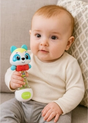 La partie transparente avec des billes colorées produit, lors des mouvements, un son agréable qui développe l’ouïe et l’attention du bébé sans bruit excessif.