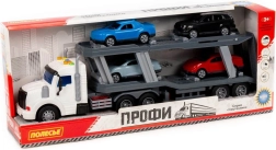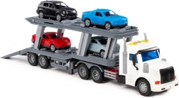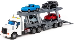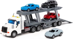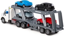 Porte-voitures réaliste pour petits conducteurs, doté d'effets lumineux et sonores, de rampes de chargement fonctionnelles et de quatre petites voitures incluses. Sa construction robuste avec cinq paires de roues sur des essieux métalliques garantit une conduite fluide et une longue durée de vie. Le jouet idéal pour les enfants qui aiment les voitures, le chargement et le transport.