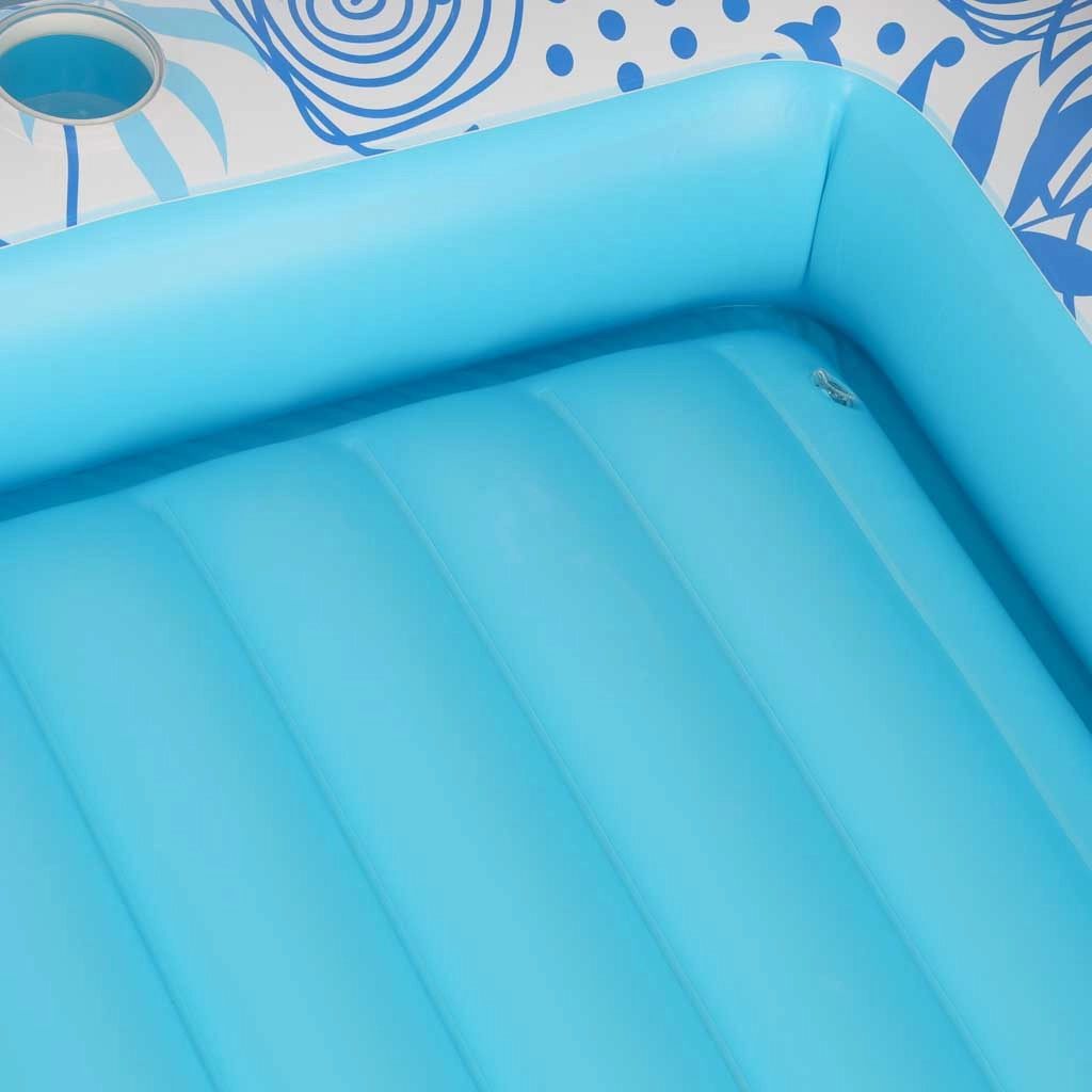 Des détails bien pensés, comme 2 porte-gobelets intégrés et une corde périphérique pour se rapprocher facilement du bord, augmentent la sécurité et le confort sur l’eau. Le PVC de 0,25 mm d’épaisseur assure une résistance à l’usage estival, tandis que la surface de couchage à cannelures souples offre un soutien agréable.