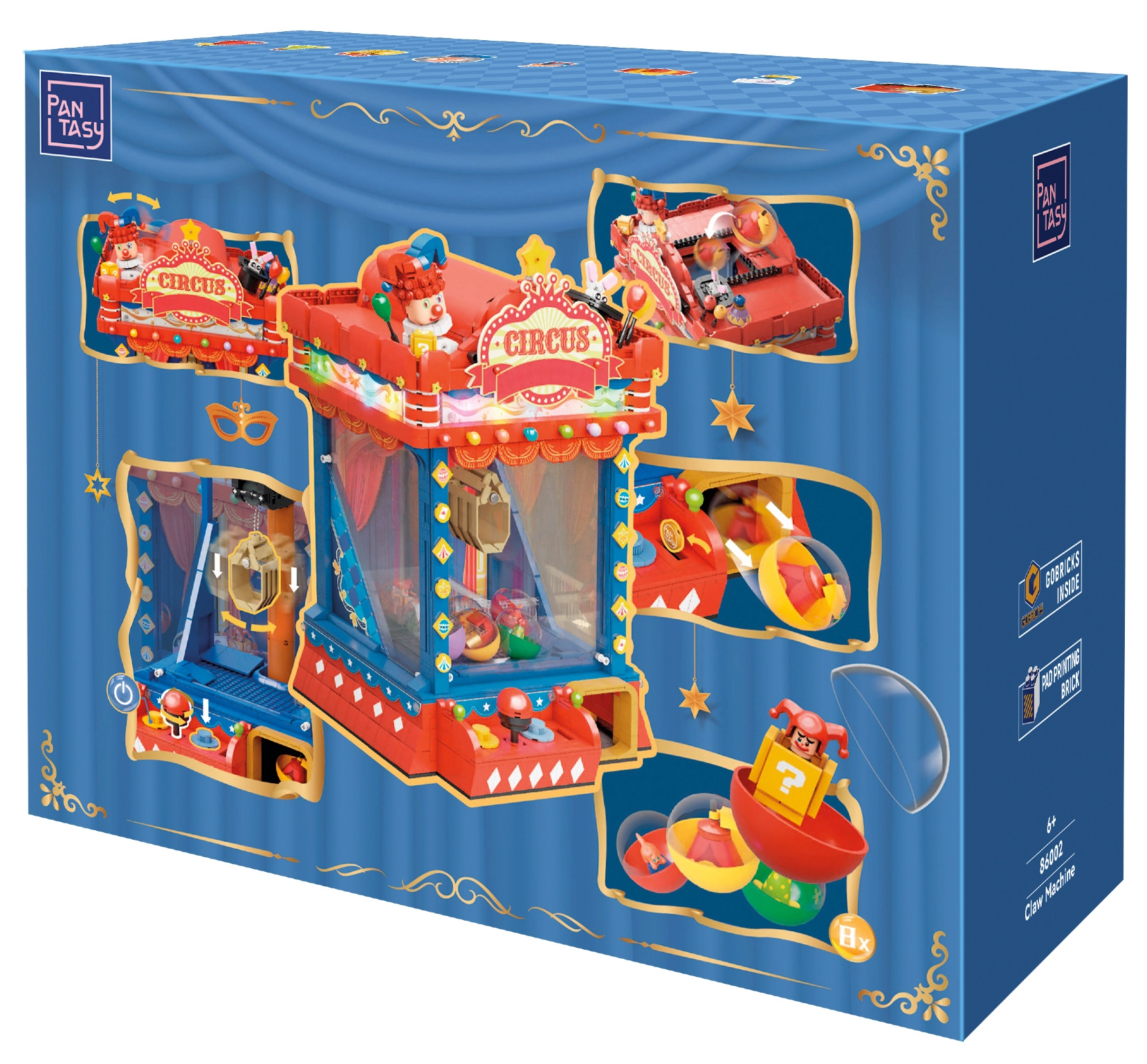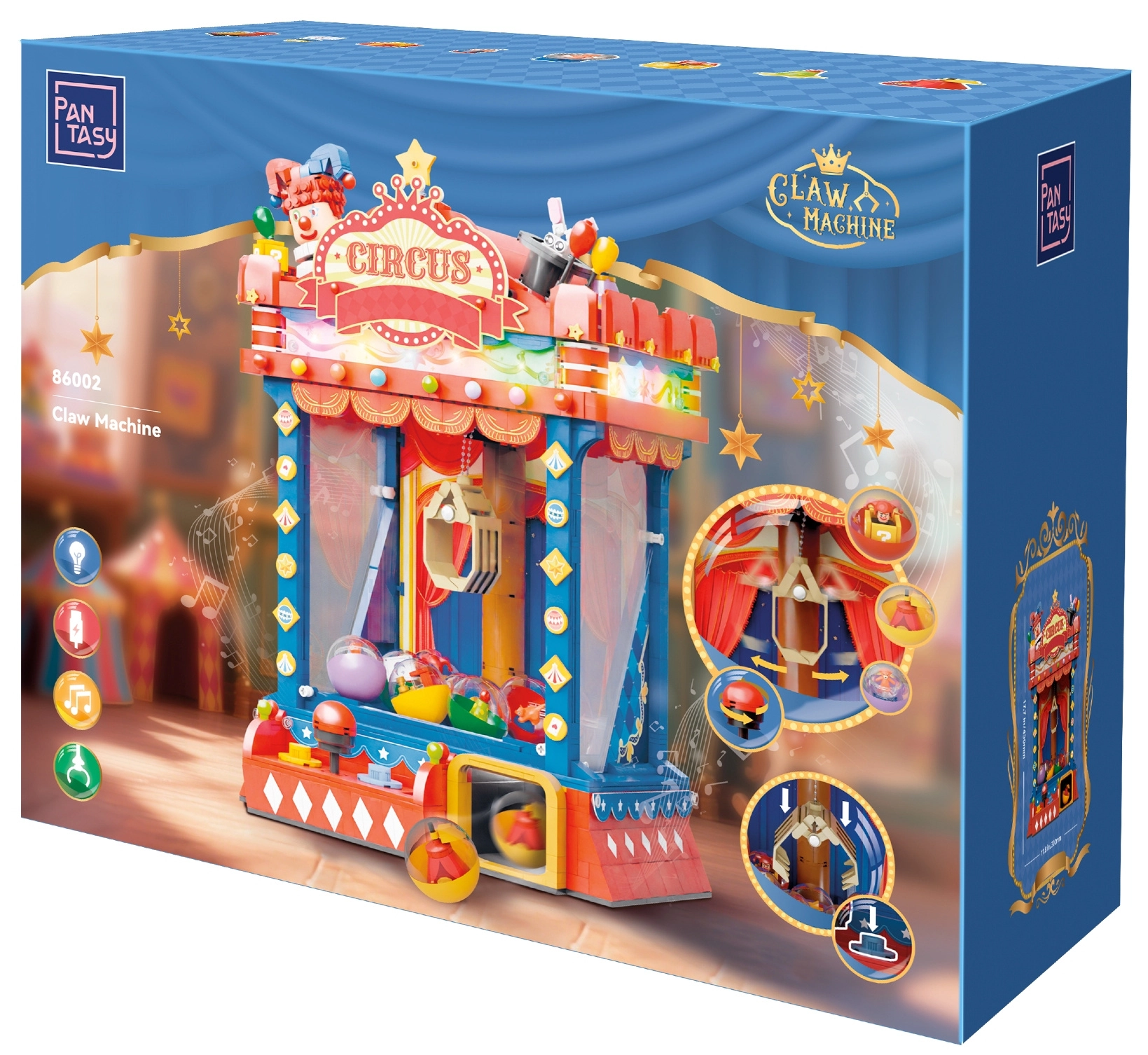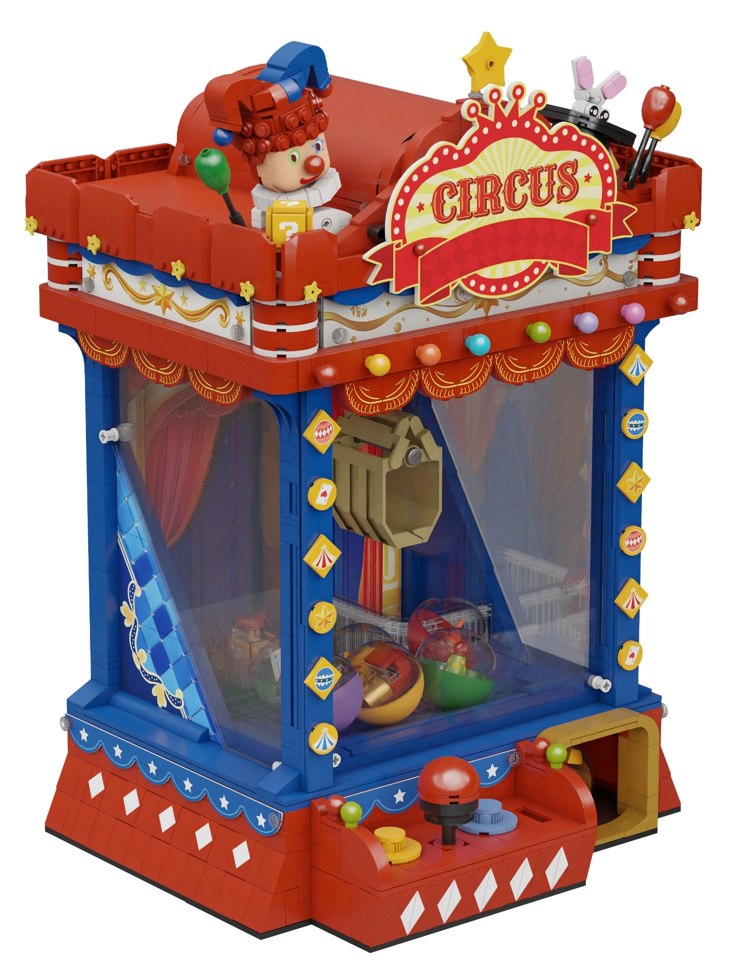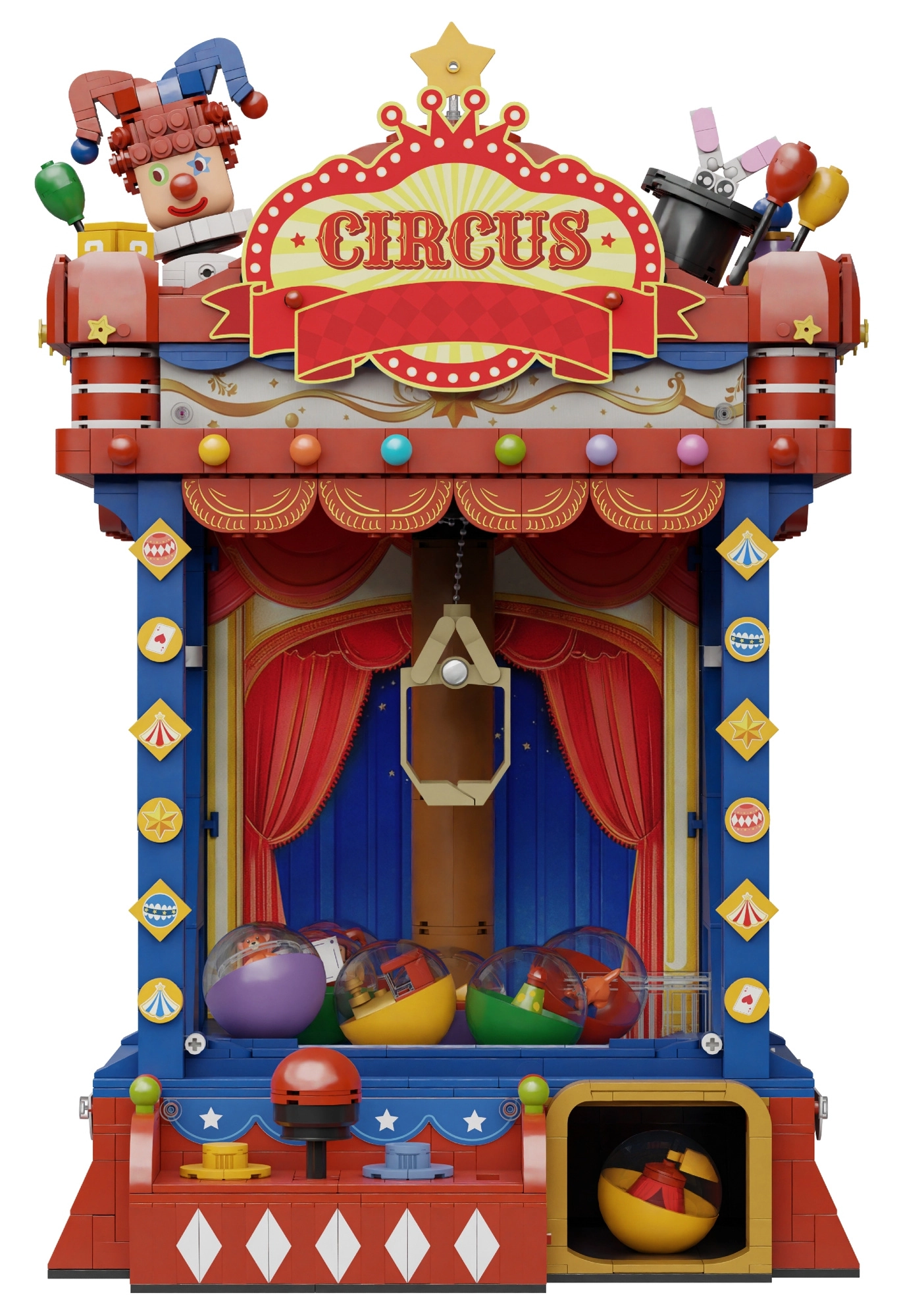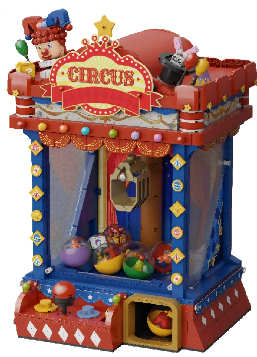 Inspiré par l’atmosphère des anciens cirques et des salles d’arcade des années 80 et 90, ce modèle se distingue par son look vintage et ses détails soignés. Une fois assemblé, il fonctionne réellement comme une machine : à l’aide du joystick, déplacez la pince, abaissez‑la et tentez d’attraper des capsules colorées surprises. Les lumières LED intégrées et le module sonore renforcent l’authenticité du jeu.