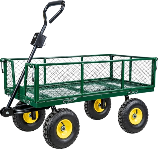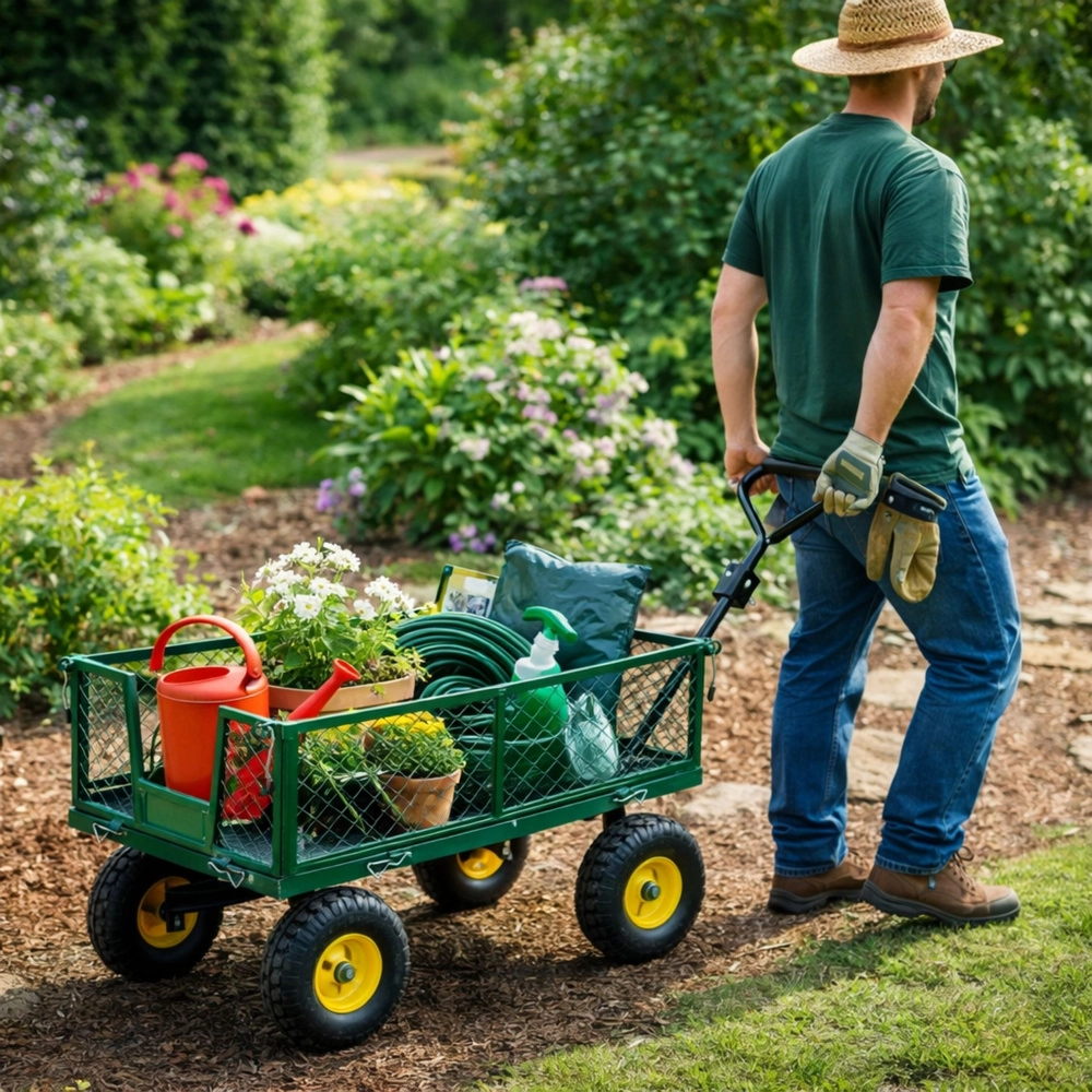 Vous cherchez une aide polyvalente pour le jardin, le chantier ou l’atelier ? Ce chariot de jardin en acier d’une capacité de 200 kg transporte terre, bois, pierres et outils. La structure stable à quatre roues avec pneus gonflables atténue les irrégularités sur gazon, gravier et dalles, et l’essieu avant pivotant garantit une direction précise même à pleine charge.