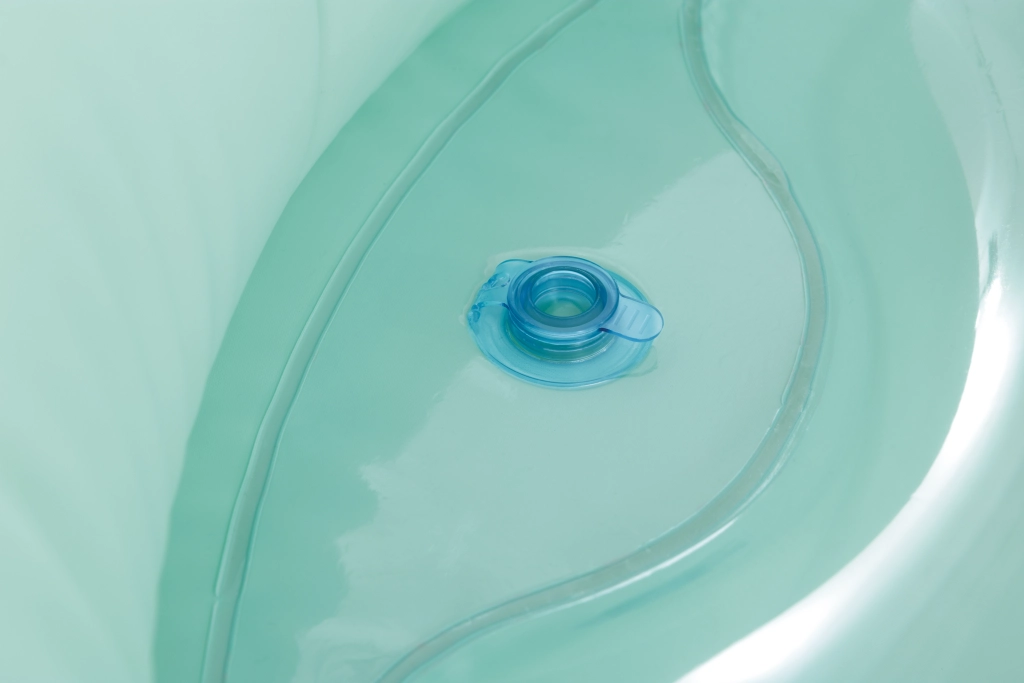 Les chambres à reliefs répartissent le poids de manière uniforme, tandis que le rebord surélevé améliore la stabilité et limite les éclaboussures par-dessus le matelas.