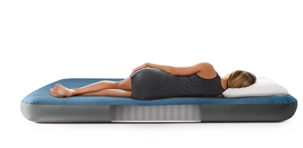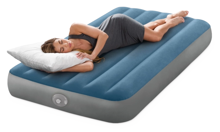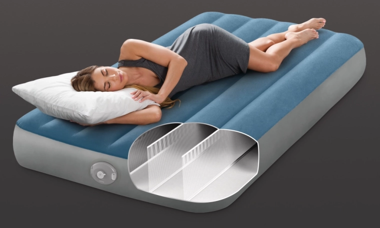 Le lit gonflable Twin Prestige Downy est conçu pour un sommeil stable et confortable. La structure brevetée Fiber‑Tech avec des milliers de fibres résistantes répartit la pression sur toute la longueur du corps, tandis que la surface doux‑velours bleu‑gris est agréable au toucher et empêche le drap de glisser.