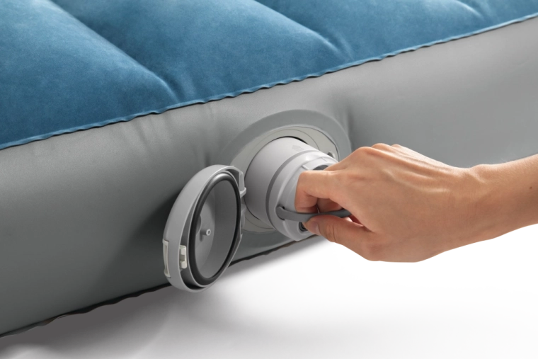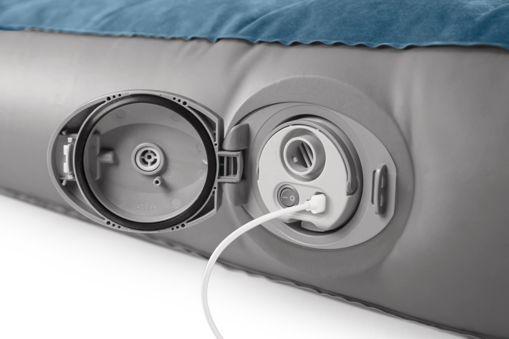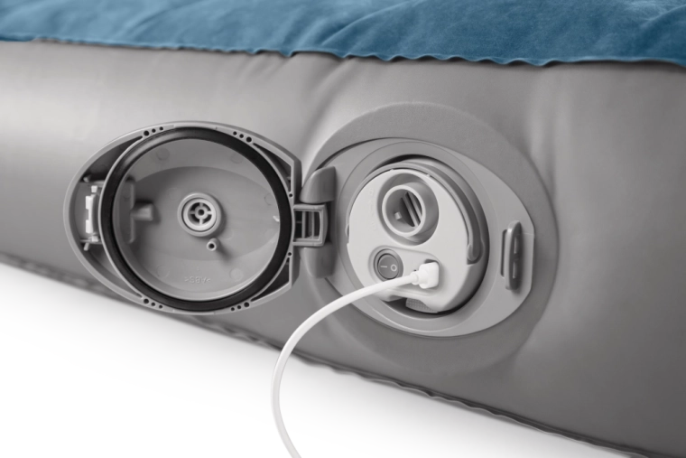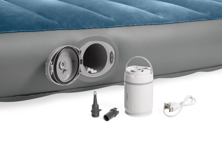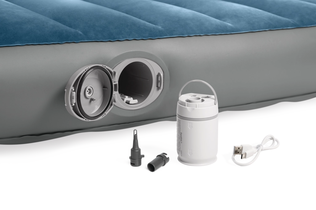 La pompe rechargeable intégrée avec batterie Li‑ion s’insère directement dans l’ouverture sur le côté du lit et permet un gonflage et dégonflage rapides. Elle se recharge via USB en environ 3 heures, dispose d’un arrêt automatique après 8 minutes et, grâce à deux embouts, peut aussi servir pour d’autres articles gonflables. Si la batterie est déchargée, le lit peut être facilement regonflé via la valve 2‑en‑1.
