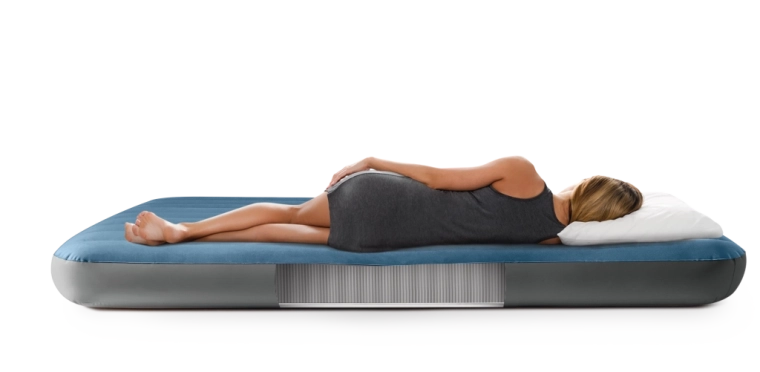 La pompe compacte s’insère sur le côté du lit, gonfle et dégonfle en quelques minutes, dispose d’un arrêt automatique après 8 minutes et de deux buses pour d’autres équipements.