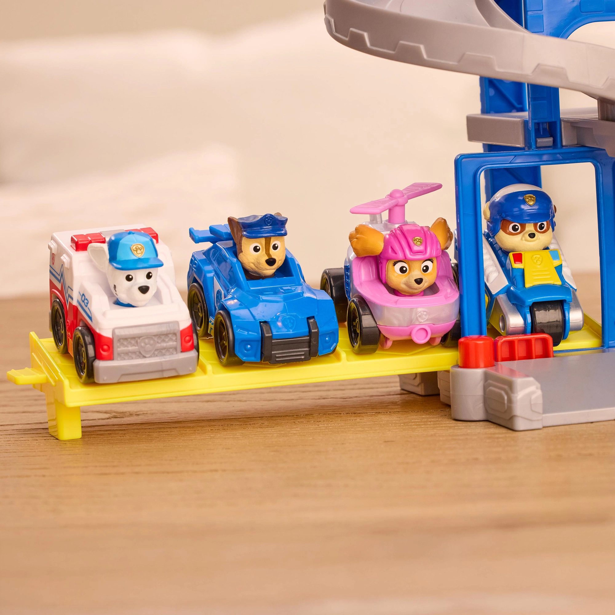 Le Pup Squad HQ est le cœur de chaque mission de sauvetage. Les enfants font monter Chase au sommet de la tour grâce à l’ascenseur rotatif, activent le toboggan et, à l’aide du lanceur, l’envoient sauver Kitty et arrêter l’espiègle maire Humdinger. Une construction robuste et colorée qui stimule l’imagination et la motricité fine.