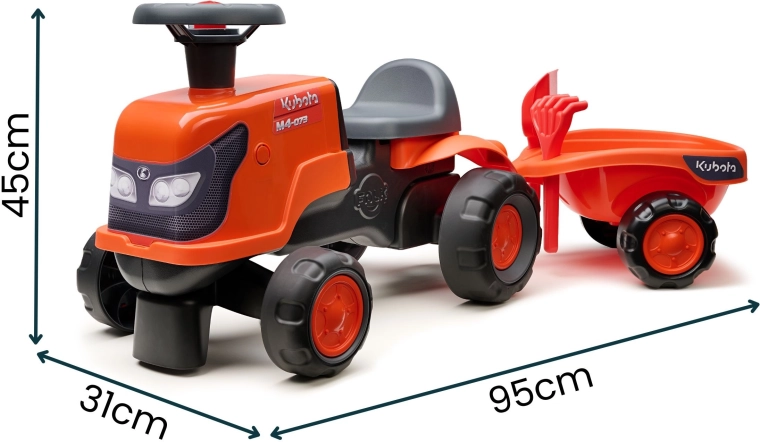 Adorable tracteur porteur FALK KUBOTA pour les plus petits jardiniers, offrant un jeu sûr à la maison comme à l’extérieur. Il dispose de roues silencieuses, d’un volant avec klaxon, d’une mini‑remorque et d’outils de sable (râteau et pelle). Fabriqué en France avec 40 % de plastique recyclé, des formes arrondies et des couleurs vives. Inclus : 2 jeux d’autocollants pour la personnalisation dont une plaque d’immatriculation personnalisée.
