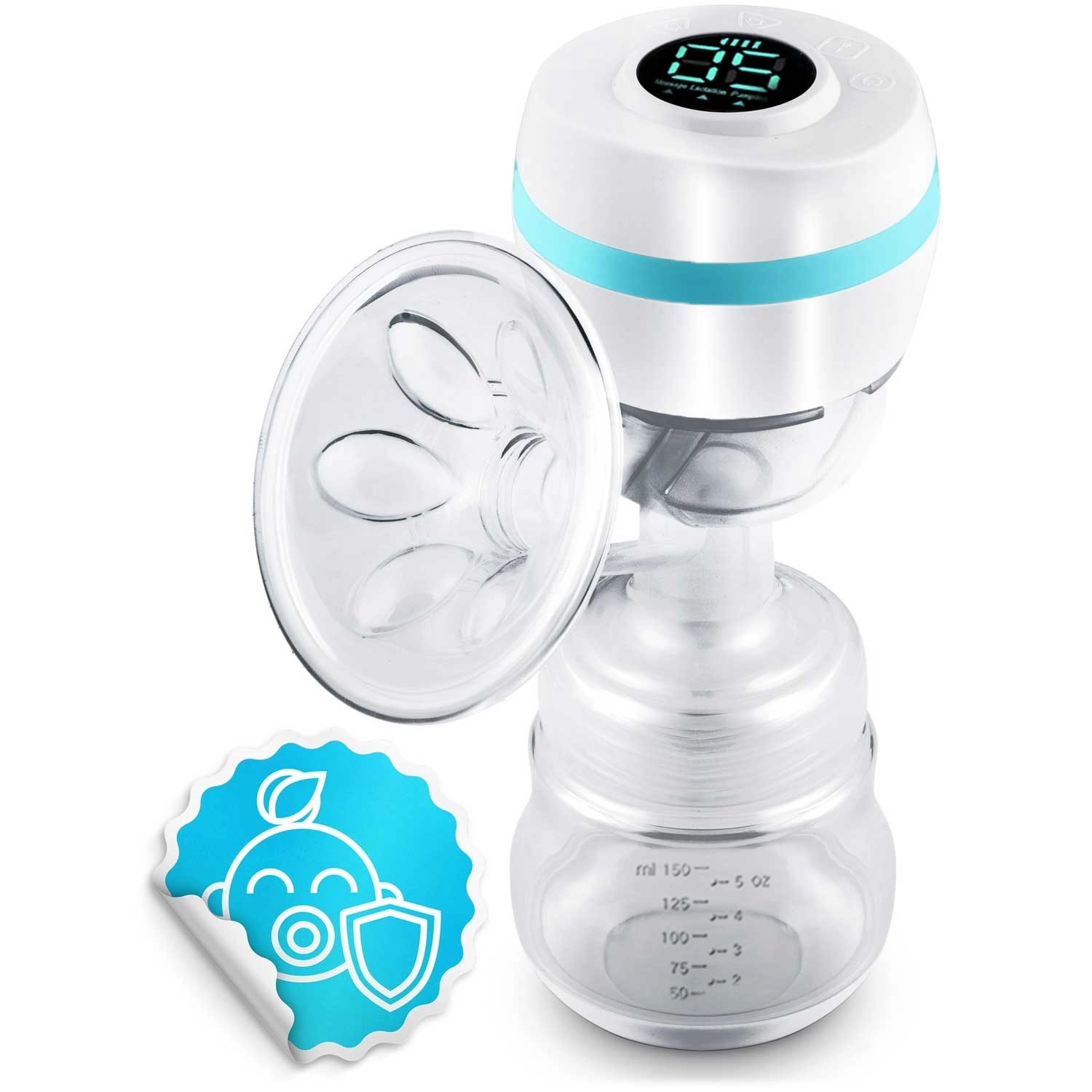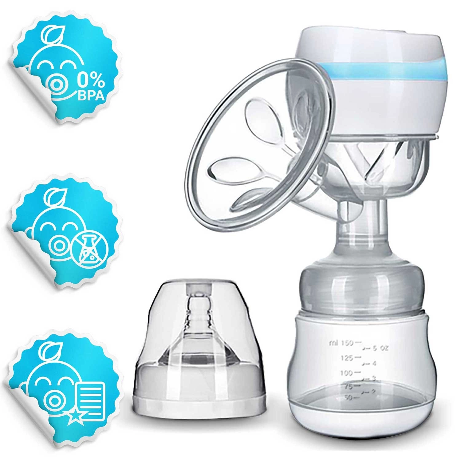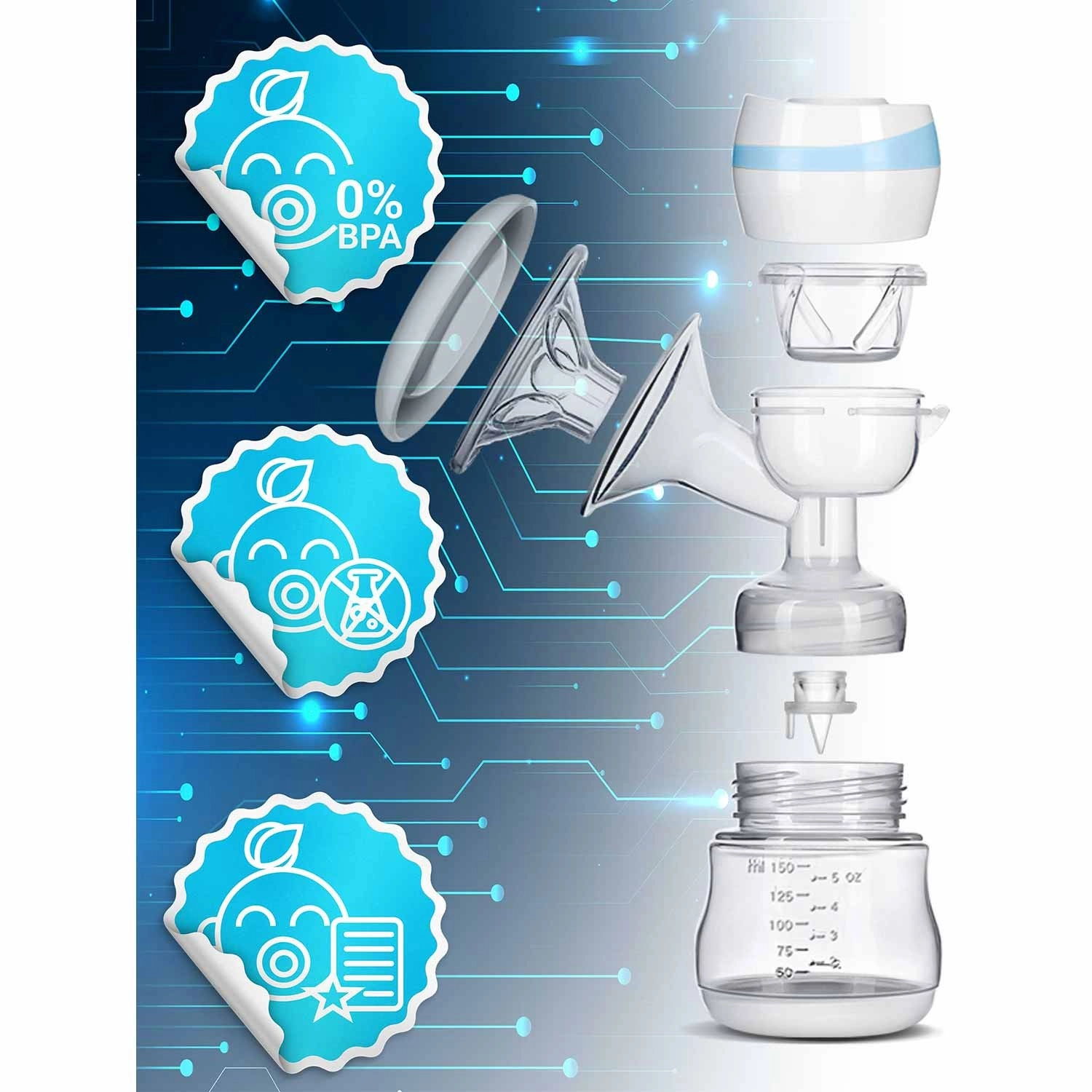La boîte contient un biberon de 150 ml gradué et des sachets refermables pour le lait (2 pcs) pour un stockage hygiénique. Le tire-lait répond aux normes de sécurité et aux certifications CE, LFGB, RoHS, REACH.
