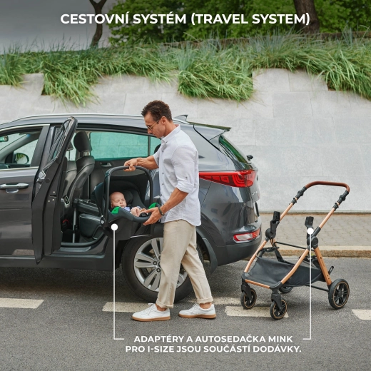TRAVEL SYSTEM inclus – comprend le siège-auto MINK PRO 2 i-Size (40–87 cm) avec adaptateurs. Il permet de transférer un bébé endormi de la voiture au châssis sans le réveiller. La sécurité est assurée par les systèmes H-GUARD+ et SPS+, et la position dos à la route (RWF) est jusqu’à 5× plus sûre. Sont également inclus dans le pack un porte-gobelet, un couvre-jambes, une housse de pluie et un sac pratique.
