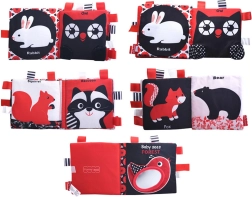 Préparez votre enfant à un voyage magique de découverte du monde des formes et des motifs avec ce livre incroyable. Conçu avec des couleurs contrastées, telles que le noir, le blanc et le rouge, idéal pour la stimulation visuelle des jeunes enfants. Le livre comprend quatre pages textiles avec des animaux comme un oiseau, un lapin, un hibou, un renard, un ours, un écureuil et un raton laveur.