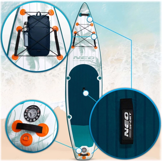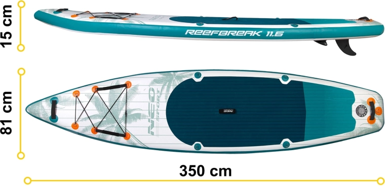 Le Neo-Sport Reefbreak est une planche SUP gonflable conçue pour la balade récréative, les sorties à la journée et les premières expériences sur l’eau. Grâce à ses dimensions de 350 × 81 × 15 cm, elle offre une stabilité et une assurance remarquables aux débutants, tout en procurant suffisamment de vitesse et de tenue de cap pour les utilisateurs plus avancés. Sa construction Drop Stitch Light, à la fois légère et rigide, garantit une haute résistance et une manipulation aisée lors du transport et du rangement.