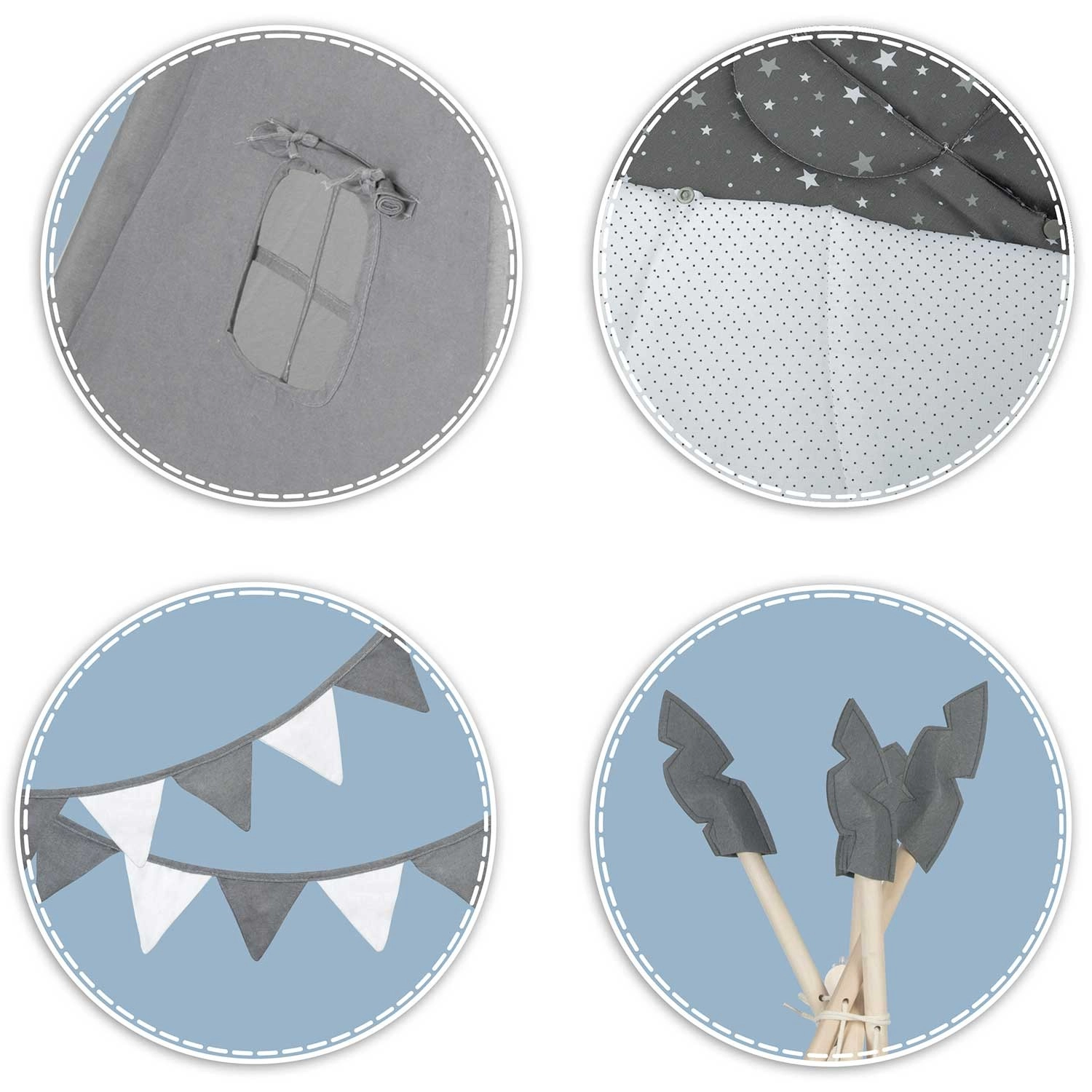 Le tipi NUKIDO est conçu en tenant compte des besoins des enfants – en mélange doux et résistant avec coton premium pour une excellente respirabilité et un grand confort. Le grammage supérieur de 175 g/m² assure douceur et durabilité, de sorte que la tente supporte sans problème les aventures quotidiennes. Les tons gris harmonieux au motif d’étoiles s’intègrent joliment à l’intérieur et favorisent le développement sensoriel de l’enfant.