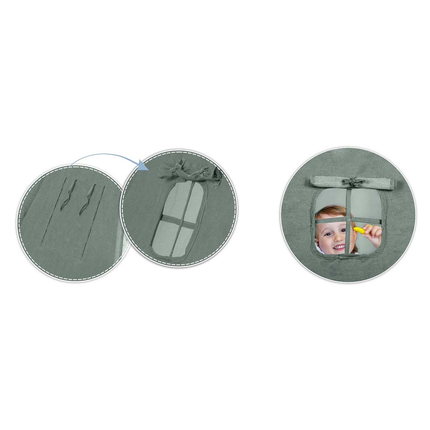 Une fenêtre avec store et liens permet d’aérer, de jouer à cache-cache et de regarder dehors. Les rideaux d’entrée se nouent facilement pour un accès confortable.