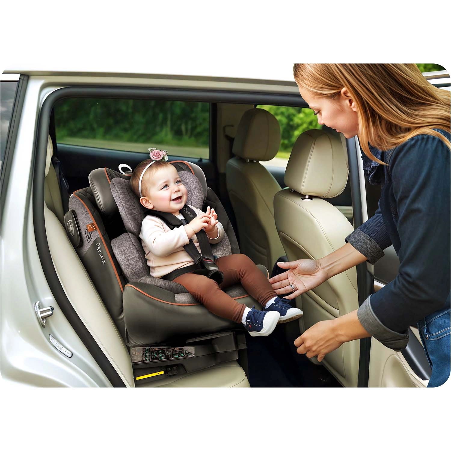 Attachez l’enfant confortablement de côté vers la porte, puis verrouillez le siège d’un seul geste en position face ou dos à la route. Le verrouillage possible sur 4 positions facilite l’usage au quotidien.