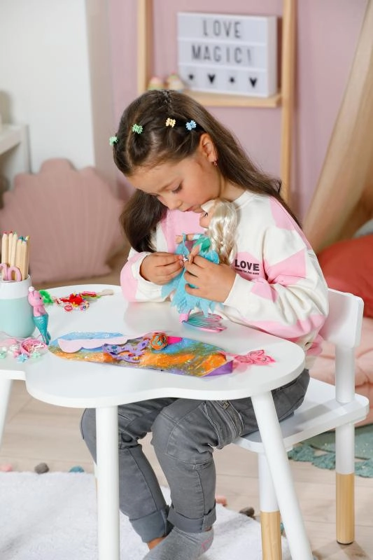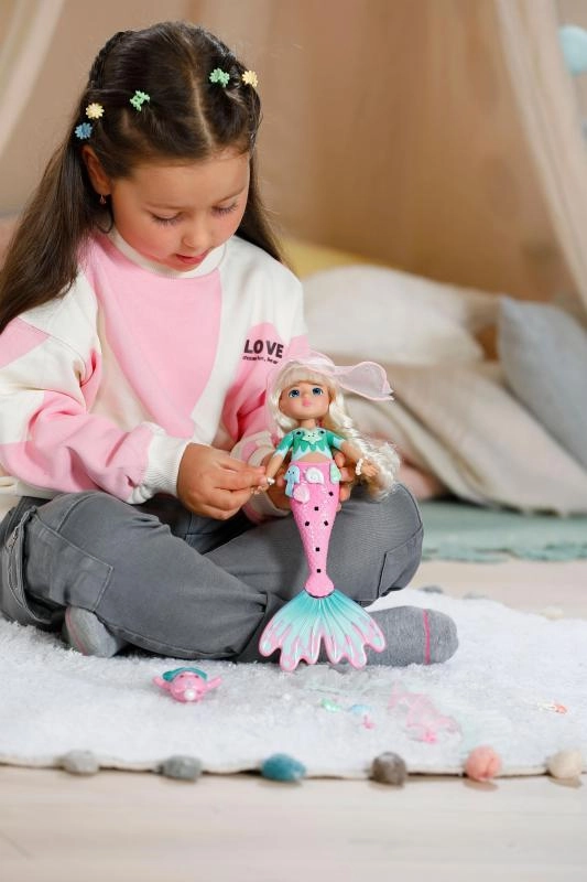 Le coffret comprend des accessoires textiles, des décorations colorées à clipser, une brochure inspirante et un adorable petit animal avec nageoire amovible. Combinez, épinglez, décorez et stylisez – toujours de façon différente et originale. La poupée est idéale pour développer la motricité fine, la créativité et l’invention de ses propres histoires sous-marines.
