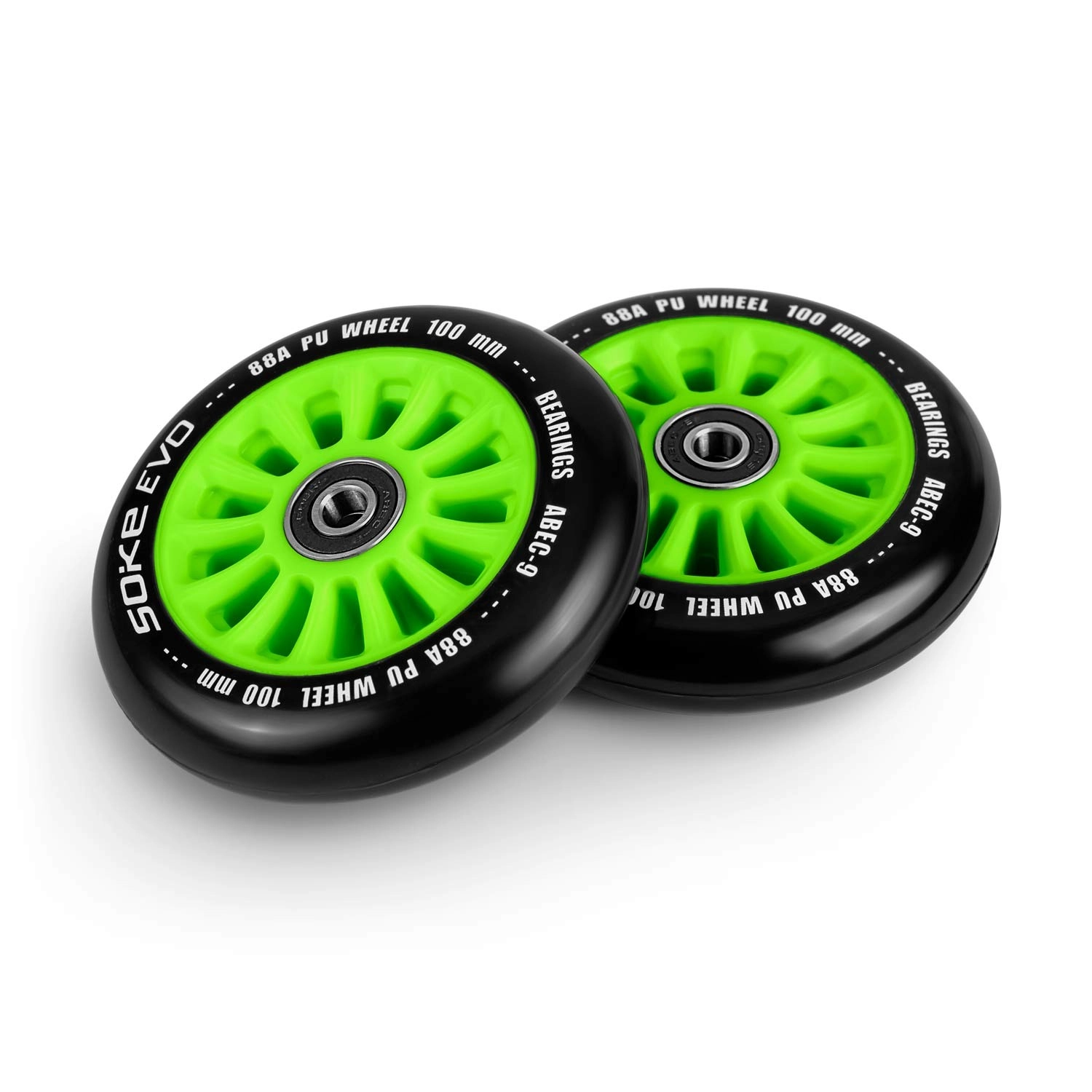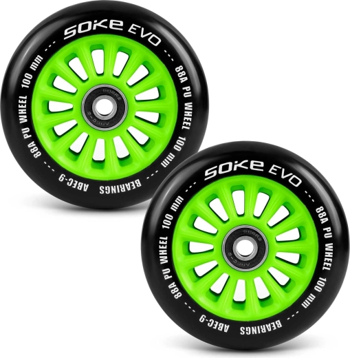 Les roues SOKE 100 mm sont conçues pour les riders recherchant plus de vitesse, de stabilité et de fiabilité lors des trajets quotidiens comme lors de l’entraînement aux figures. Le mélange de polyuréthane 88A assure une bonne accroche et une faible résistance au roulement, tandis que les roulements ABEC-9 offrent une accélération vive et des démarrages en douceur.