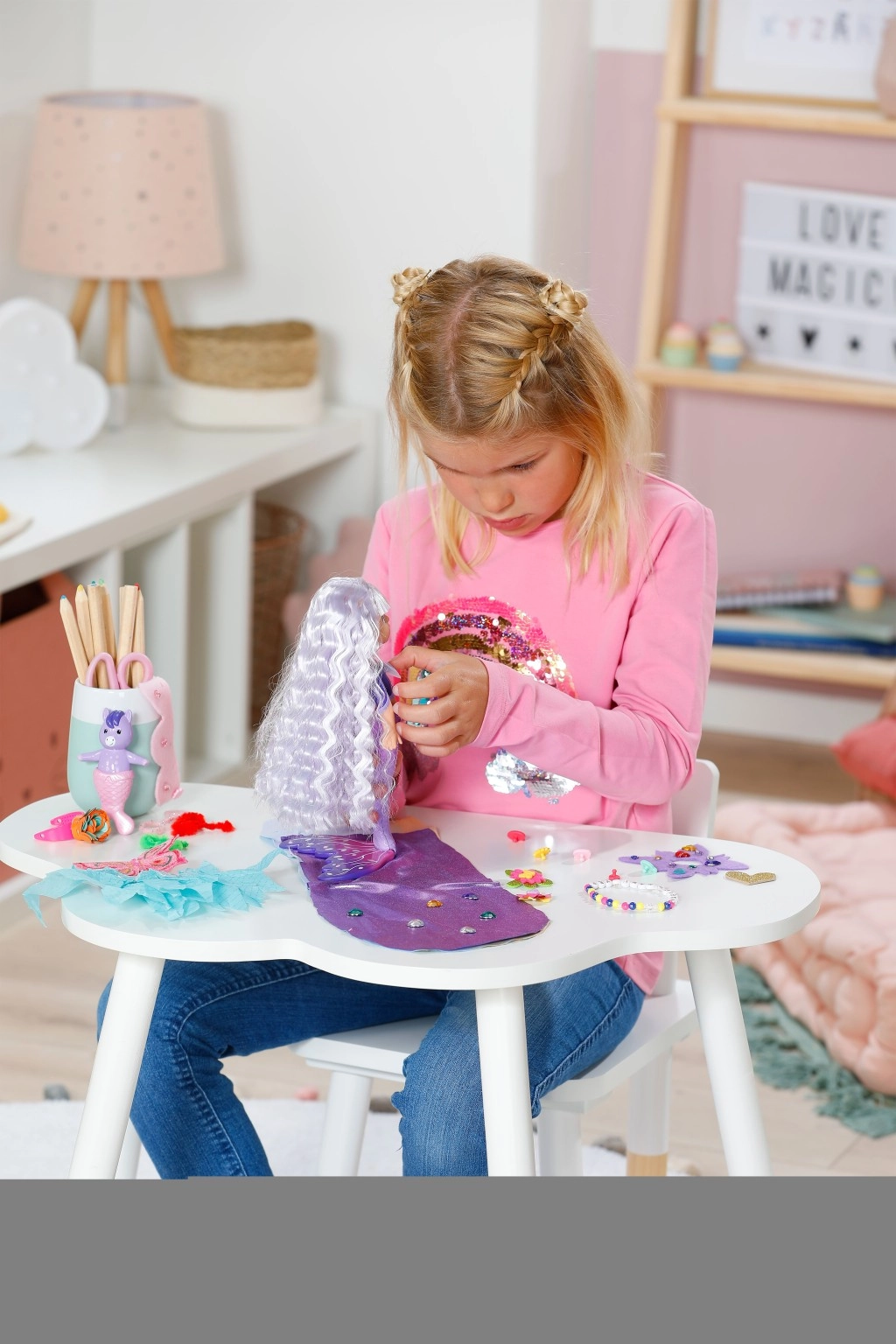 Le set comprend des accessoires textiles, des décorations à clipser et un adorable animal avec nageoire amovible. La brochure fournie propose des idées DIY pour personnaliser la poupée et les accessoires avec des matériaux disponibles à la maison. Aura est un choix idéal pour les enfants dès 4 ans qui adorent le styling créatif, le jeu de rôle et l’amusement plein d’éclat.