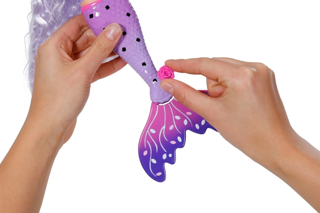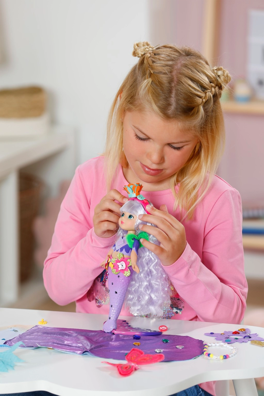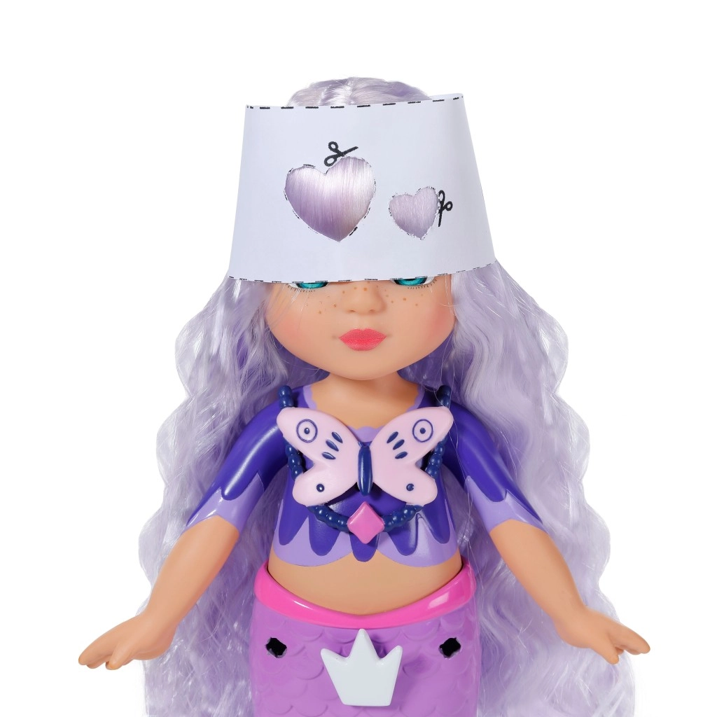 Découvrez un monde de créativité avec la poupée BABY born sirène Aura de la gamme Glam Up. Grâce à son effet UV magique, ses longs cheveux violets changent de couleur au soleil, tandis que vous pouvez la coiffer, décorer et styliser de la tête jusqu’à la nageoire. La boîte contient des accessoires textiles, des ornements colorés à clipser, un adorable compagnon animal et un carnet d’inspiration – pour créer chaque jour un look unique.