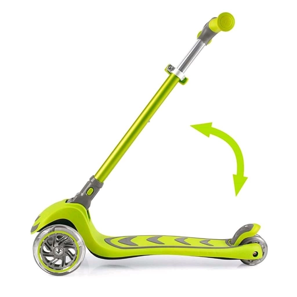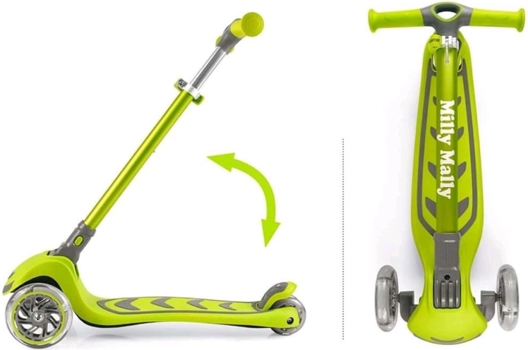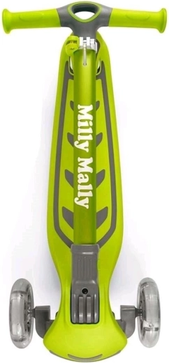 Trottinette pour enfants légère et durable Milly Mally Boogie en vert, qui ravira les petits riders dès 3 ans. Elle offre une construction stable à trois roues avec double roue arrière, roues avant lumineuses et une structure en aluminium pour une longue durée de vie. Direction par inclinaison du corps, guidon réglable en hauteur et plateau antidérapant pour une conduite sûre et amusante.